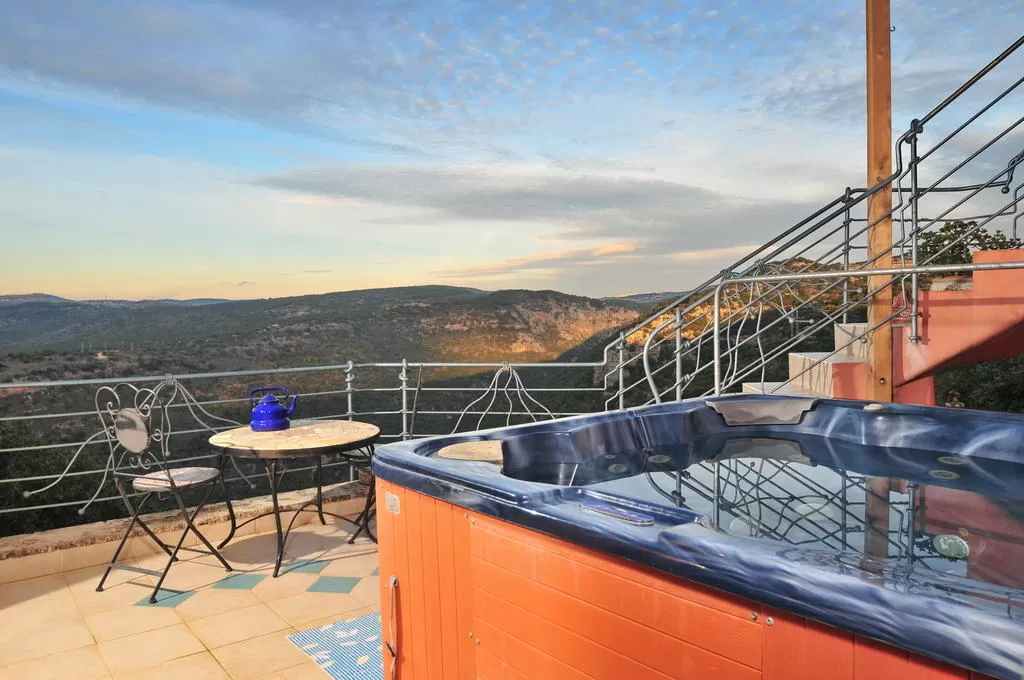 Izmaragd offers an unconventional design – rough wooden furniture and earthy colors, yellow and light blue throw me into the rural areas of Spain or Mexico, and the view through the windows reinforces the feeling that I am not in Israel. The large unit offers a kitchen and dining area, a beautiful wooden bar, a large living room with a fireplace, and large windows for the view. The adjacent balcony has a private spa jacuzzi, and on the roof there is a charming lounge area.