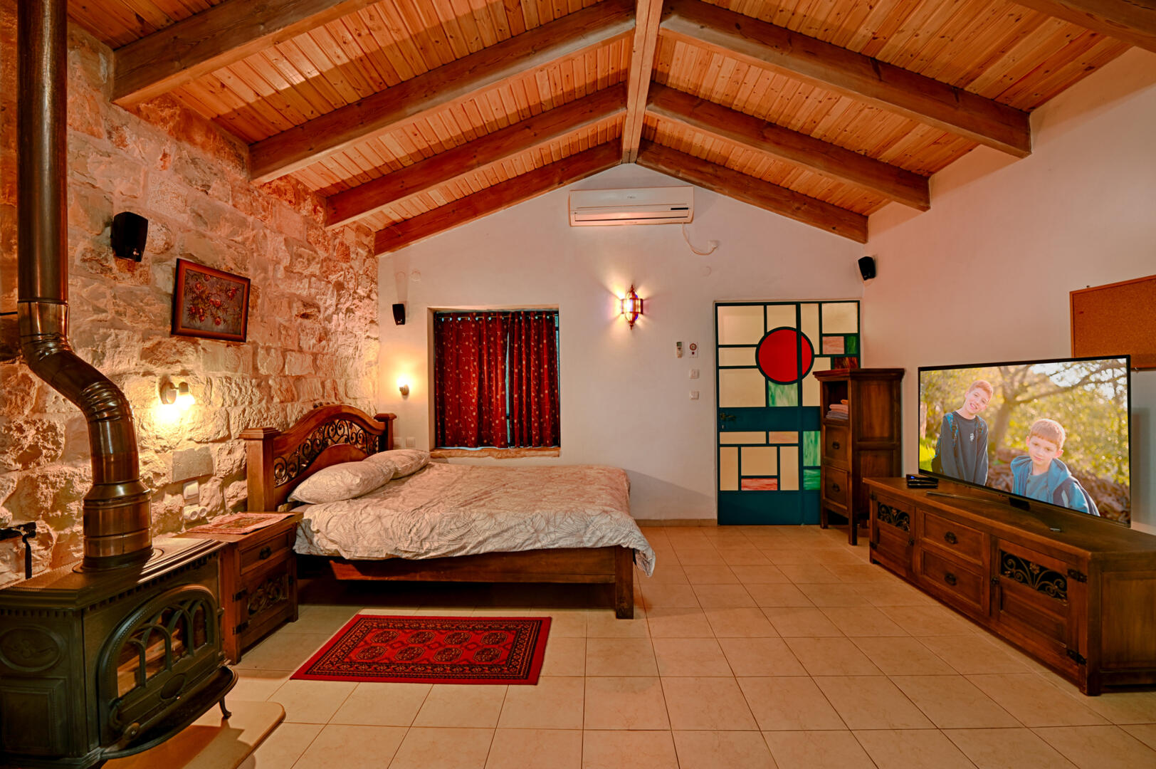 Two of the B&Bs are built as a space that is suitable for a couple, and one has a separate sleeping area. You can stay here with children (sleeping on mattresses, a pull-out sofa, or a single bed - depending on the B&B). There is a wide double bed with an orthopedic mattress, a cozy sitting area with a cozy wood-burning fireplace, and a large smart TV. The "Rimon" B&B has a cozy round jacuzzi tub in the central space, and in the "Zait" B&B it is located in the bathroom. Above both are windows that bring the forest and the Galilee landscape inside. In "Tana" the double sleeping area is located in a beautiful niche with windows, and it is hidden behind a curtain.