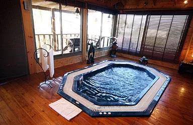 It is a huge cabin (one, large and open space), with huge glass walls that surround about half of the cabin and open it to the garden. The windows are covered with delicate Venetian wooden shutters. You can open the Venetian blinds and then you will find yourself immersing yourself in a huge jacuzzi surrounded by nature and vegetation (I wonder how it looks at night...)