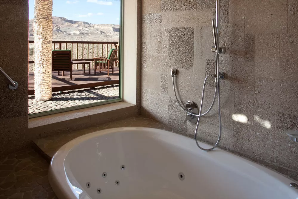 The suites, which incorporate local natural materials (a lot of stone and pebbles), are designed to blend in with the natural landscape and are open to it so that it penetrates into each of the rooms that make it up. Yes, also (and mainly) for the bathroom. Each of the double suites has a jacuzzi overlooking the view. In the double suite, the jacuzzi is in the spacious and beautiful bathroom, which is also open to the view.