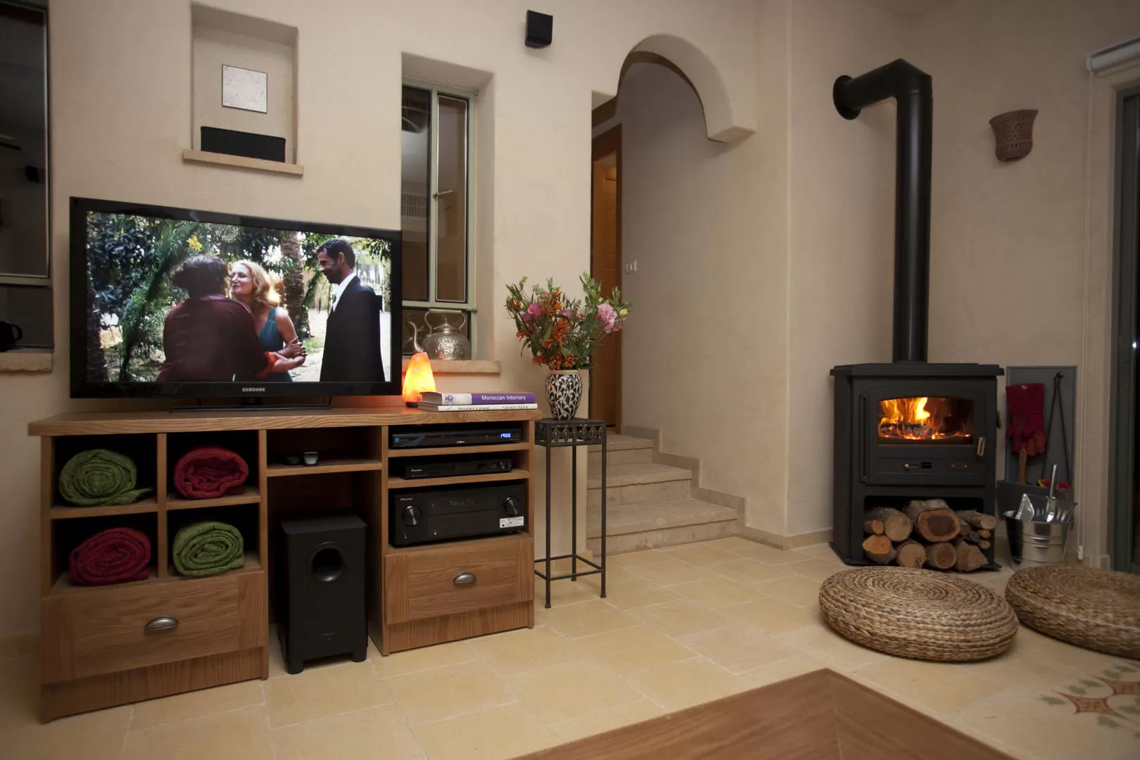 Colored glass stained glass in the ceiling, natural plaster, decorative niches in the walls and a clean and harmonious design make the feeling in the building very unique. A wood-burning fireplace will warm the heart and body in winter. An excellent and quiet air conditioner will make the hot hours pleasant. A well-equipped kitchen, healthy treats in and out of the fridge, and a fine entertainment system complete everything that is needed. A neat charcoal grill awaits right outside, for the fire lovers.