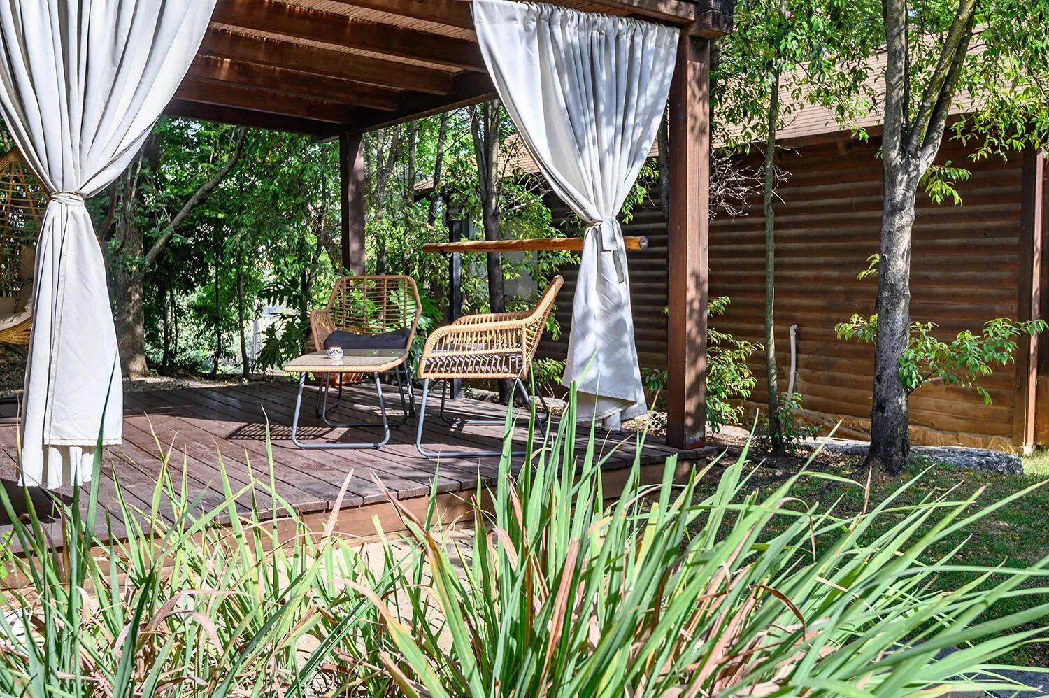 Each cabin has a private covered yard built on a wooden deck and framed by green garden areas. In the courtyards of the "Winter" and "Summer" cabins, guests will find a spacious spa jacuzzi. To achieve privacy in this area, you can move a curtain hanging at the entrance to the courtyard.