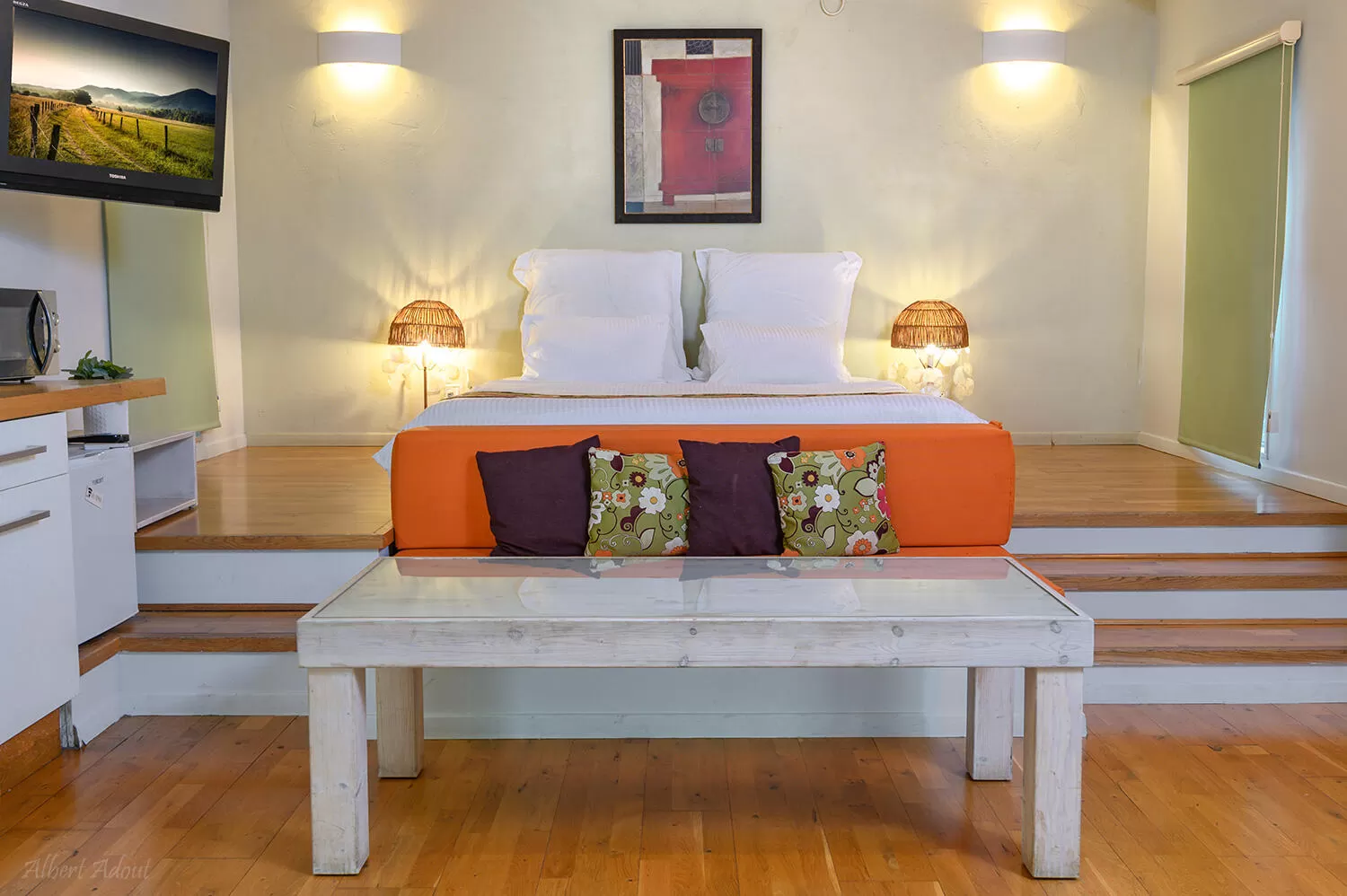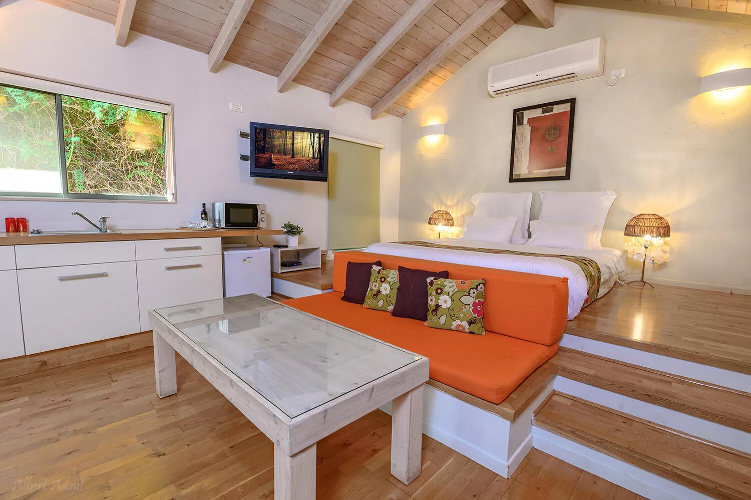The living room has an orange bench with decorative cushions and a wood coffee table.  The bathroom has a double Jacuzzi, an open shower and long mirror.  The shower has a double shower head and separate toilets.