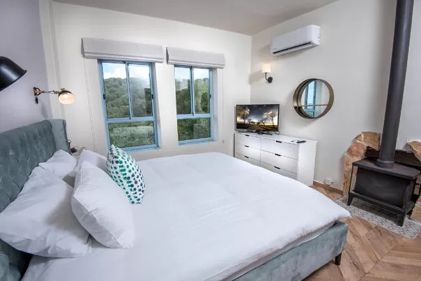 בצד השני יש את חדר השינה ובו מיטה זוגית מתכווננת, ארון בגדים, טלוויזיה וחדר רחצה עם 2 ראשי גשם.