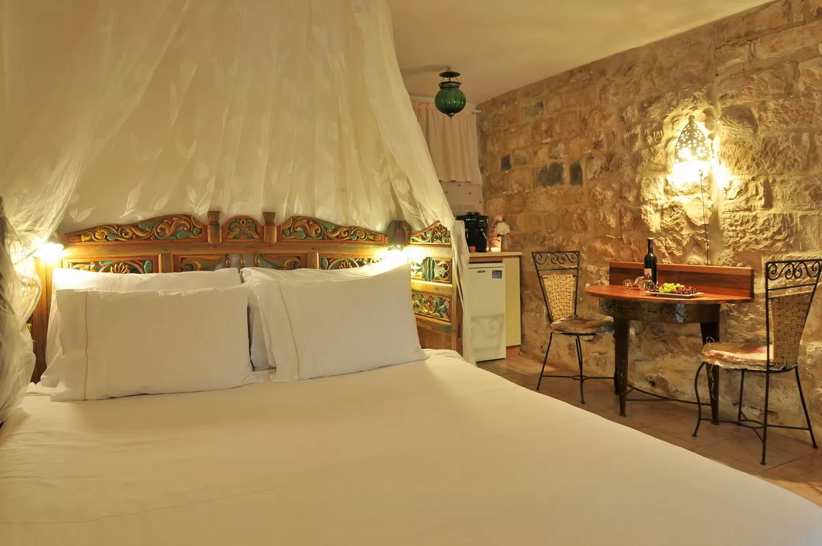 " Mount Canaan " Suite - The name itself suggests the Galilean, rootsy and authentic design. A graceful and intimate suite built of ancient stone. There are many stained glass windows, pictures, and plenty of decorative items. The suite is divided into niches that create comfortable and intimate spaces. Here too you will find fine furniture, a jacuzzi, a coffee machine and a host of pampering.