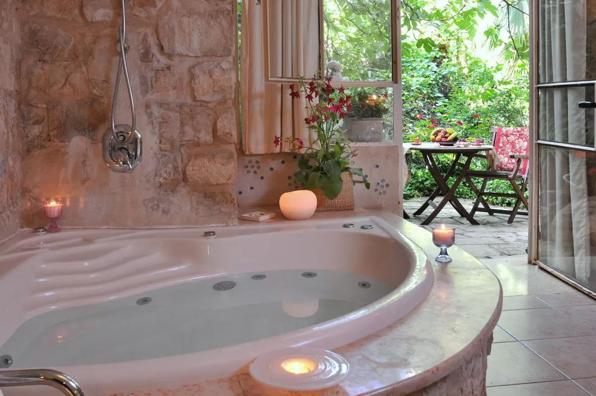 The "Baron Rothschild Suite " is the newest suite in the complex, which continues the special line of incorporating stone as a central motif in the interior design. In the suite, located not far from the shared wading pool, you will find a large and luxurious double bed, a large round jacuzzi, a kitchenette with a coffee machine, and a well-appointed bathroom. In the suite, white spa robes and soft cotton towels will await you. The suite has a private outdoor seating area that sits on a terrace.