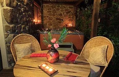 The closed courtyard of the suite offers a pergola for shading and a bamboo fence for separation and isolation. The yard is a kingdom in itself. Here you will find a huge jacuzzi-spa, another dining area, sitting areas, a green lawn and plenty of potted plants.
