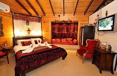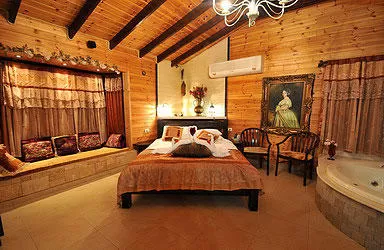 The atmosphere in the "Shir" cabin is full of exciting sweetness, one that brings a smile, invites a hug and begs for a kiss. A juicy color palette that combines rich shades of burgundy with touches of green, oriental-style fabrics, spotlights for perfect lighting above the bed, the jacuzzi, the "royal" curtains with a lace crown, the floral decorations in the style of a rustic painting, the abundance of candles - all of these make the cabin sensual, enveloped in a caressing, bewitching and seductive feminine softness.