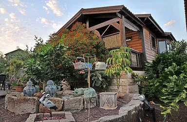 The "Tzlili HaPamonim" B&B complex has 4 identical wooden cabins. One of them, "Song Cabin", has complete privacy, and is recommended by the summit guide. The cabin's outdoor area includes a secluded balcony with a bamboo fence and a graceful dining area decorated with unique collectibles, a charming garden with a collection of antique iron utensils, and a yard filled with many fruit trees among pleasant picnic areas. The pool area, jacuzzi spa, and dining and barbecue area are shared by all cabins.