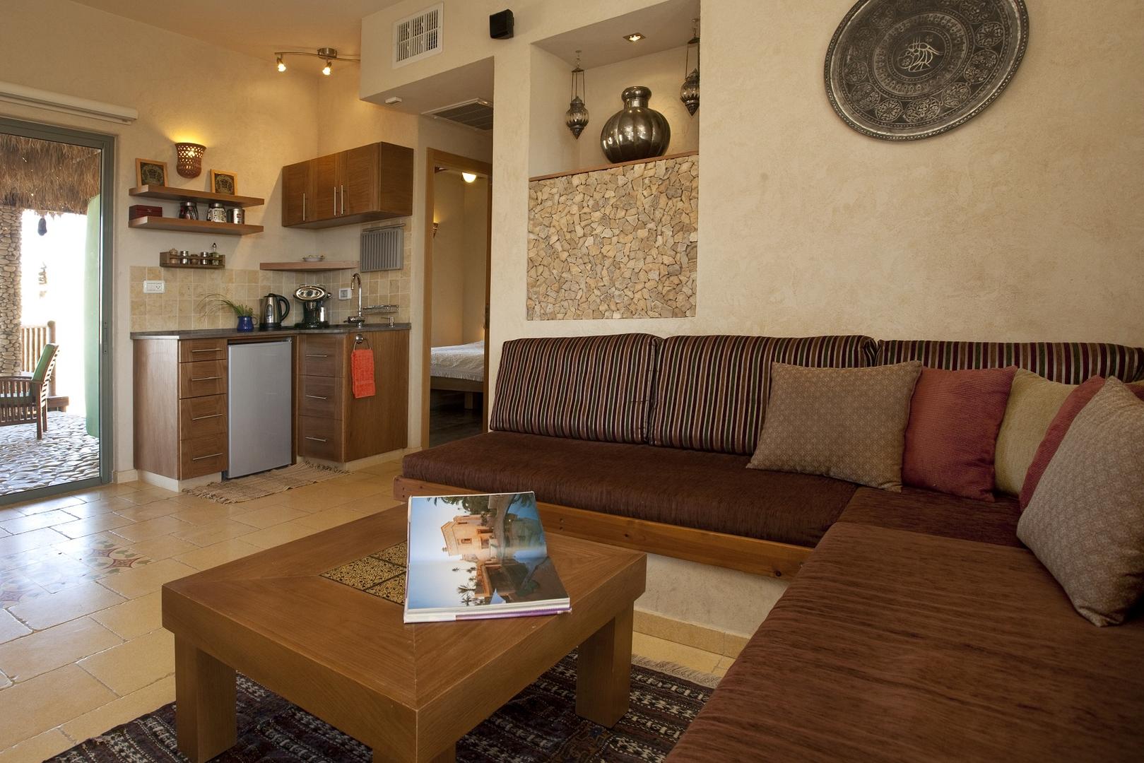 הסלון נפתח אל מרפסת עם בריכת טבילה (מחוממת ומקורה) ו"דק" המצוייד במזרוני רביצה, בו ניתן לצפות הרחק אל הנוף המדברי המרהיב. לא קל לבחור כאן היכן לשהות...