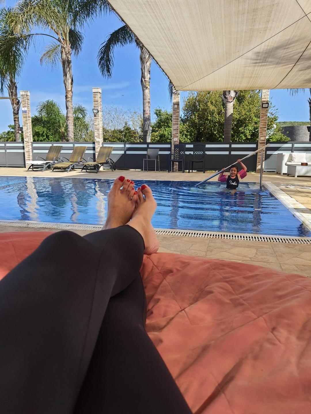 כשאני מצליח לקום (נראה אתכם עוצרים אחרי שתי עוגיות...), היא לוקחת אותי למתחם וכבר בכניסה אני מבין איזה צבע יהיה לביקור שלי. המון המון ירוק ממלא את השטח הגדול ש-3 בקתות זהות מציצות ממנו, ובריכה גדולה בנויה ומרשימה מאוד משקיפה אל נוף, נכון, הישוב בעל אופי חקלאי ושומעים מדי פעם קרקור של תרנגולות ממתחם סמוך, אבל בינינו- זה רק מוסיף לקסם הירוק הזה.
