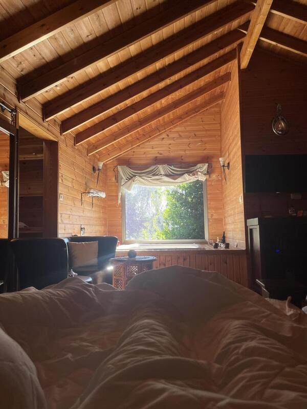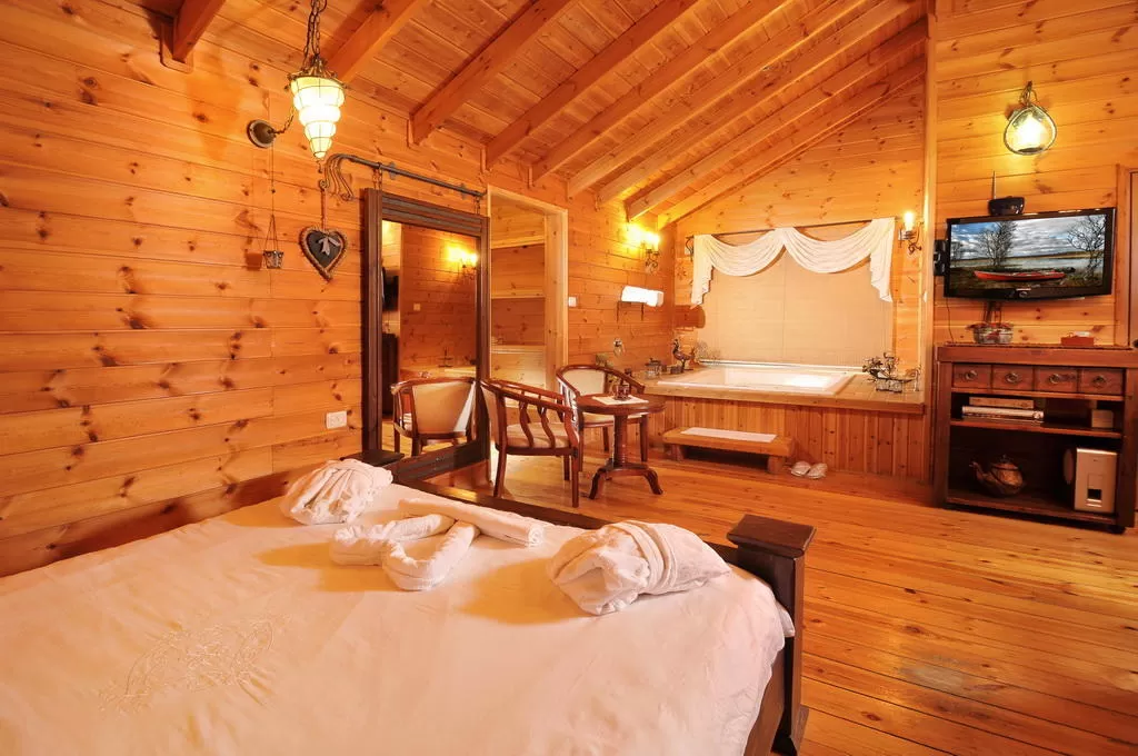 בתוך כל הירוק הזה ישנן 3 בקתות עץ. כל אחת מהן בנוייה כחלל אחד, עם כל מה שאפשר לצפות, כולל ג'קוזי שמשקיף לחצר דרך חלון גדול ויפה, מסך LCD, מטבחון כפרי וחדר רחצה. נקי ונחמד פה, אבל עם כל הכבוד לצבע החום ששולט בפנים, תנו לי עוד קצת מהירוק שבחוץ.