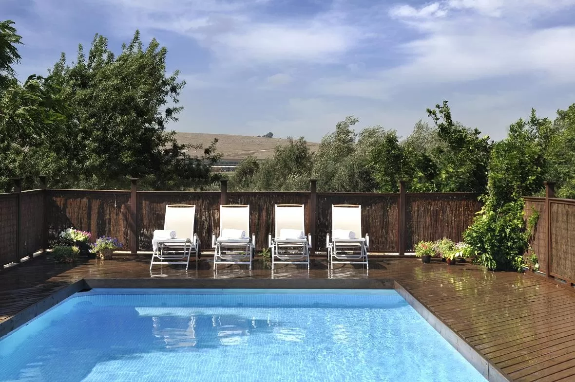 ג'קוזי שקוע ברצפה ממוקם בפינה מול שני קירות חלון ענקיים שמכניסים את הגינה פנימה (לא לדאוג, וילונות ההחשכה טובים). אני יוצא ומרגיש את שמש יוני מעלה הילוך. מזל שיש בריכה. היא גדולה ויפה, מוקפת "דק" ופינות ישיבה, וצופה אל מטע הזיתים הצמוד והשדות.