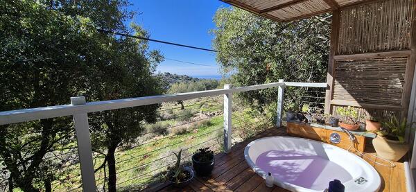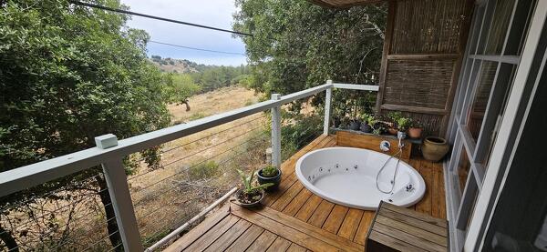 קמין עץ ומטבחון יפהפה בסגנון כפרי משלימים את האבזור. הג'קוזי (שאינו ספא) ממוקם "נכון" על קצה המרפסת המקורה, הטובלת בצמחיה מלבלבת.