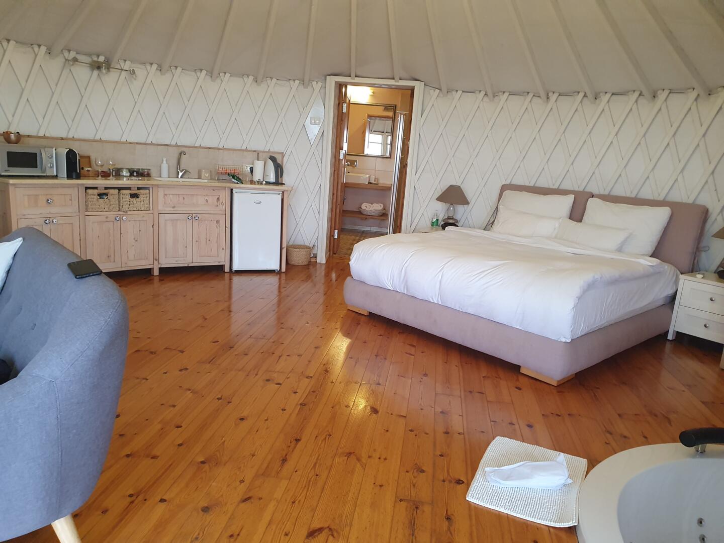 על הרקע המרהיב הזה משובצים שני מבנים יפיפיים, אוהלי "יורט" לבנים בסגנון מונגולי, גם הם כאילו צוירו ביד האומן. הצורה העגולה של המבנים מתכתבת עם פסי השמיים הקמורים, ומשתלבת בנוף הרך בטבעיות ואותנטיות מפליאה.  לכל אחת מהסוויטות מרפסת מקורה עם "דק" פרטי ש"תלוי" מעל הצוק, צופה אל הנוף הפנורמי ומכיל בריכת שחיה מחוממת.