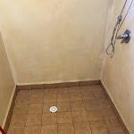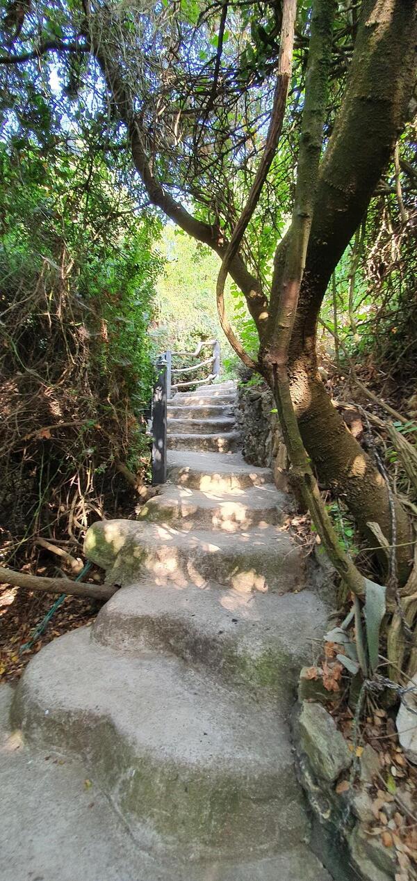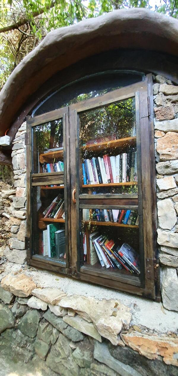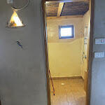 דינה הובילה אותי אל הבקתה במורד השביל המדורג המצופה טיח אדמה, החומר ממנו היא בנויה. המדרגות עשויות מצמיגים שנעטפו גם הם בחומר. דינה מסבירה כי בתהליך הבנייה לא הובאה אדמה ולא הוצאה פסולת מתוך העיקרון לנסות ולהשפיע כמה שפחות על הסביבה.