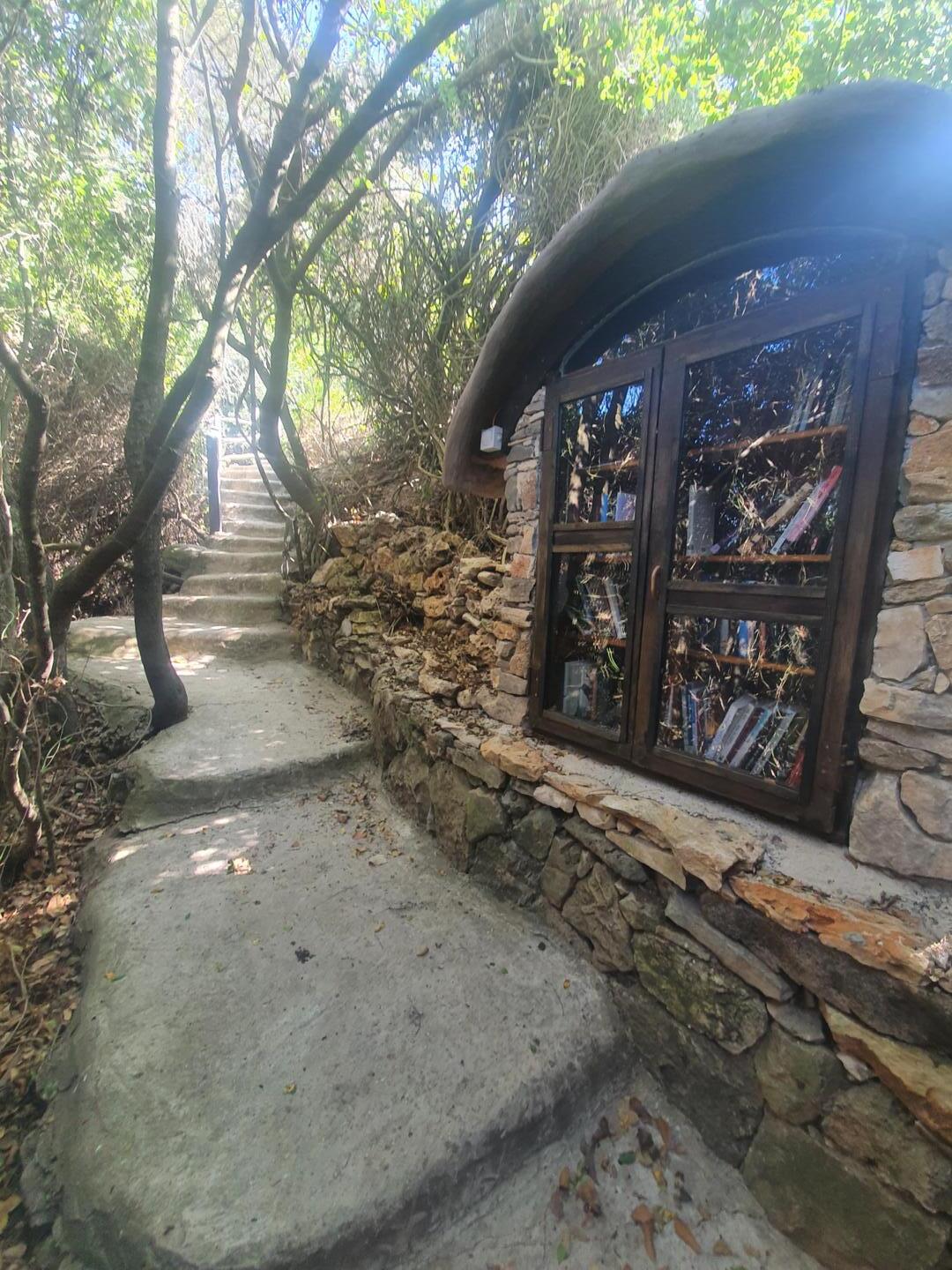 דינה הובילה אותי אל הבקתה במורד השביל המדורג המצופה טיח אדמה, החומר ממנו היא בנויה. המדרגות עשויות מצמיגים שנעטפו גם הם בחומר. דינה מסבירה כי בתהליך הבנייה לא הובאה אדמה ולא הוצאה פסולת מתוך העיקרון לנסות ולהשפיע כמה שפחות על הסביבה.