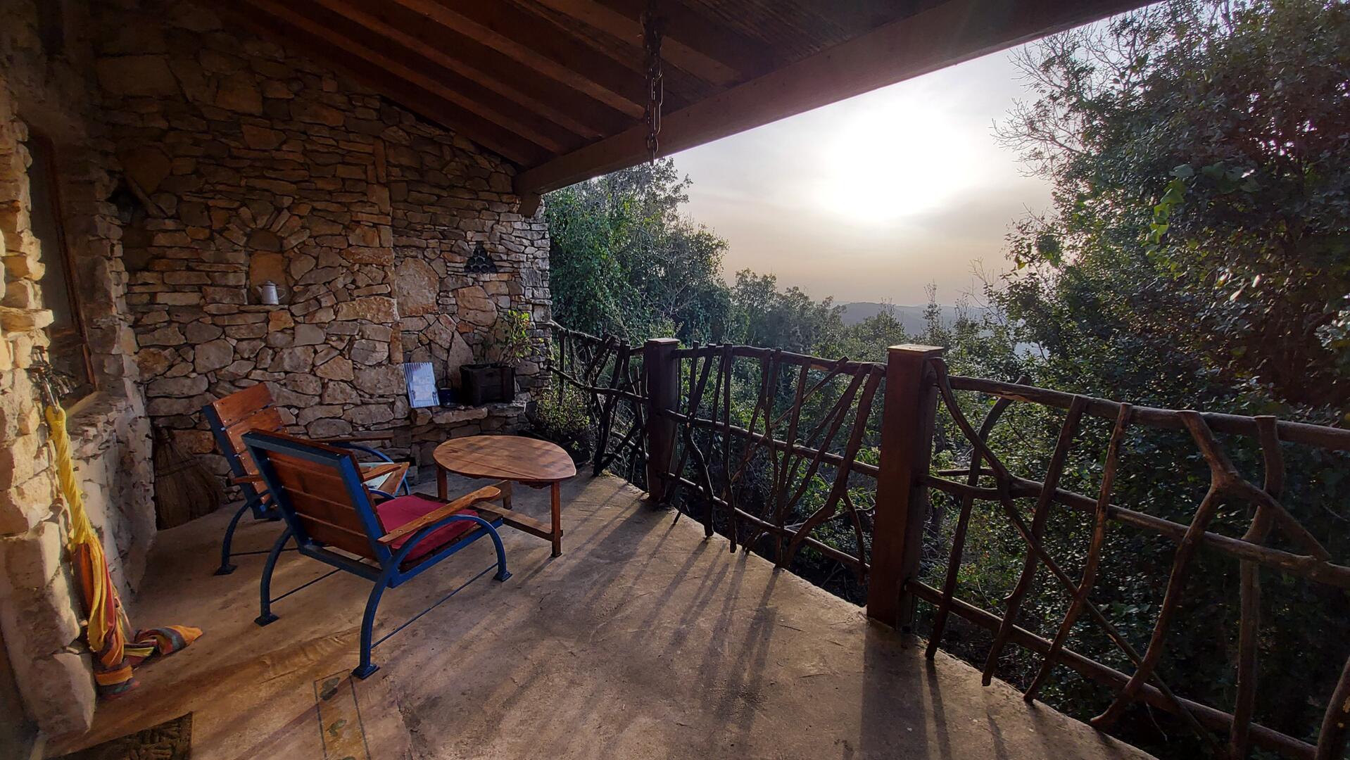 הכניסה אל הבקתה היא דרך מרפסת ענקית היושבת "על" החורש הטבעי וכדי שלא תיפלו, תחמו אותה במעקה שעשוי מאותם ענפים שהורידו ע"מ לפנות מקום לבניית הבקתה. מהמרפסת נשקפים יובליו העליונים של נחל בצת ובזמן שקיעה כדאי להביט מזרחה שם רואים אותם בשיא תפארתם ועוצמתם.