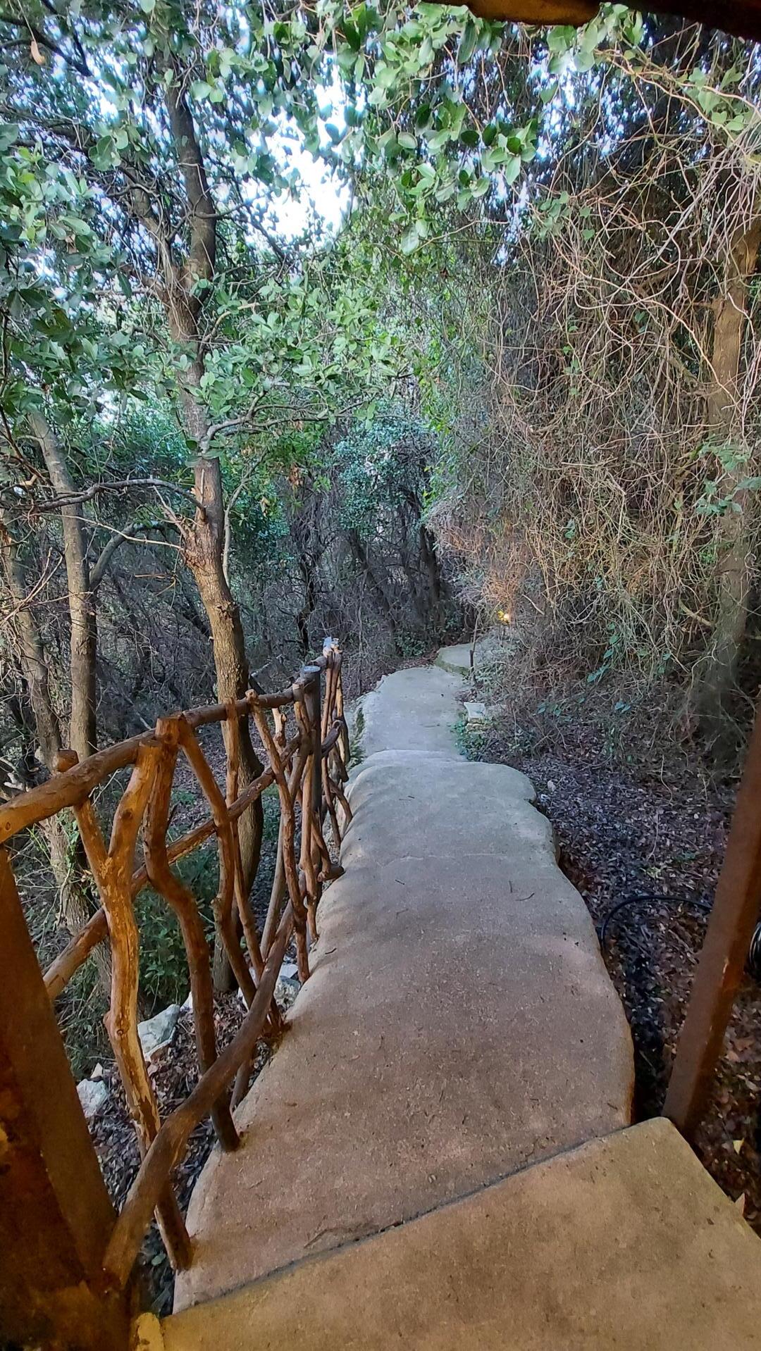 דינה הובילה אותי אל הבקתה במורד השביל המדורג המצופה טיח אדמה, החומר ממנו היא בנויה. המדרגות עשויות מצמיגים שנעטפו גם הם בחומר. דינה מסבירה כי בתהליך הבנייה לא הובאה אדמה ולא הוצאה פסולת מתוך העיקרון לנסות ולהשפיע כמה שפחות על הסביבה.