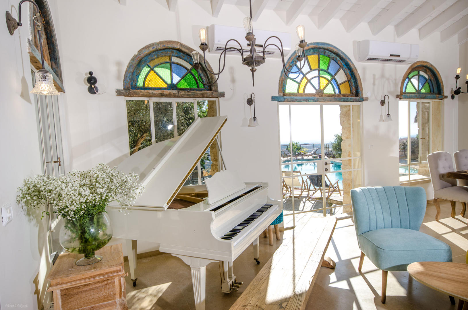 בחלל המשותף יש סלון, מטבח, פסנתר, מרפסת עם בריכה, נוף עוצר נשימה וריחות משכרים של טבע.