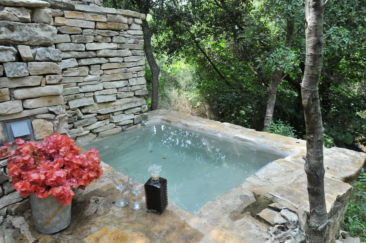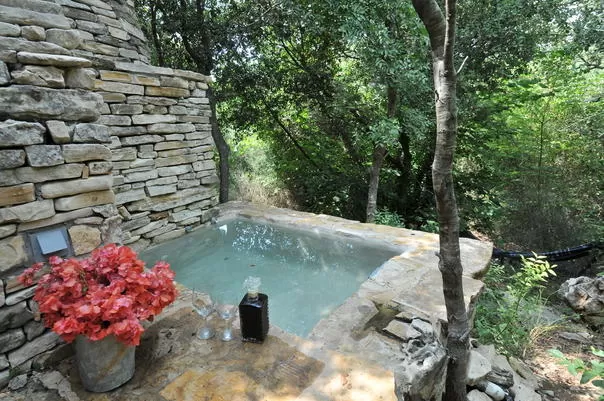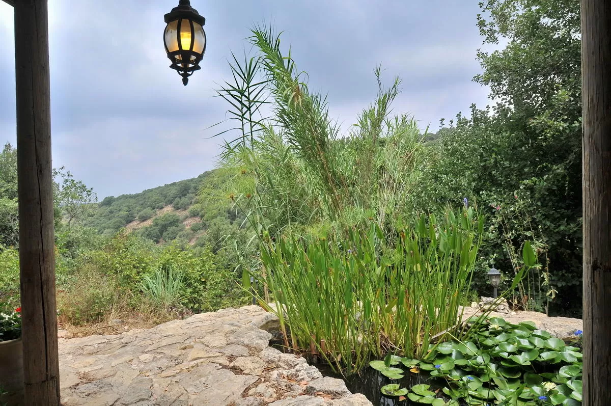 שני מבני אבן זהים ממוקמים על קצה הטרסה הרחבה, באותו מפלס. קיר אבן מפריד בין שתי המבנים ויוצר פרטיות מושלמת. אני מתישבת לרגע על ספסל האבן בחצר המקורה של אחד מהם. בריכת דגים יפיפייה, שקט מופלא, פכפוך המים, ריחות החורש. הגיע הזמן להיכנס.