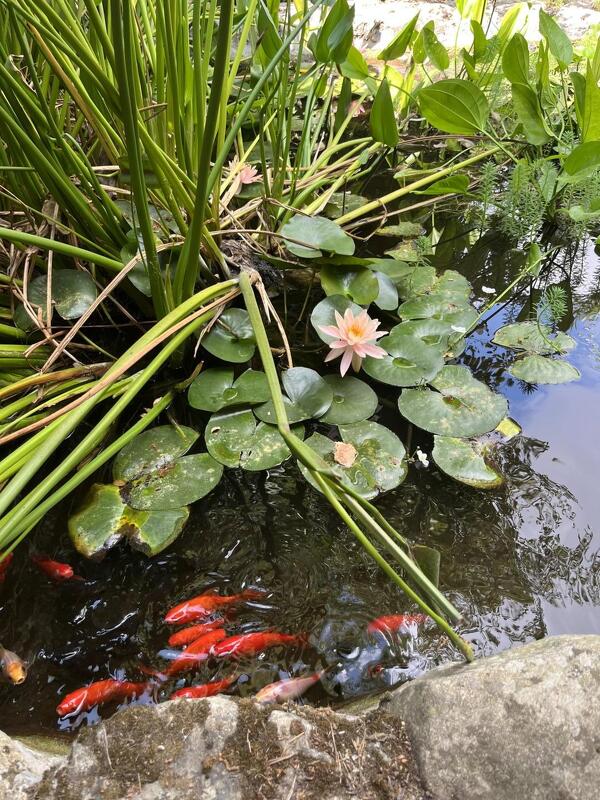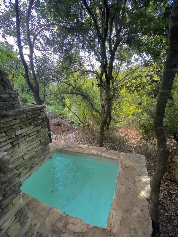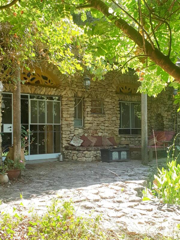 שני מבני אבן זהים ממוקמים על קצה הטרסה הרחבה, באותו מפלס. קיר אבן מפריד בין שתי המבנים ויוצר פרטיות מושלמת. אני מתישבת לרגע על ספסל האבן בחצר המקורה של אחד מהם. בריכת דגים יפיפייה, שקט מופלא, פכפוך המים, ריחות החורש. הגיע הזמן להיכנס.
