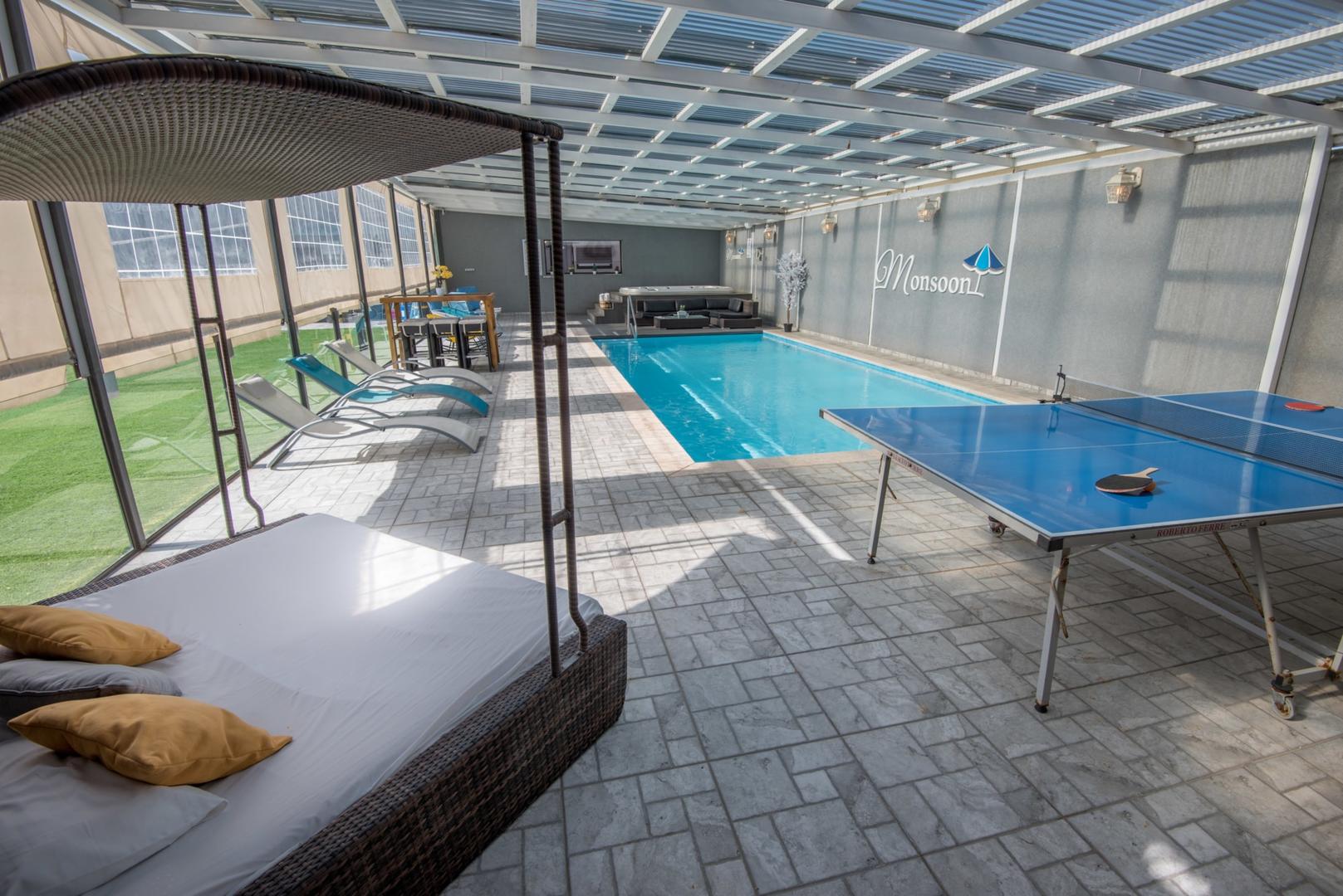 מתחם החוץ מכיל בריכת שחייה פרטית ובנוייה עם פינות ישיבה פזורות.