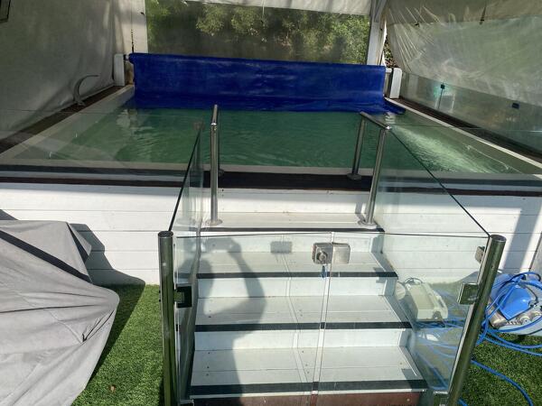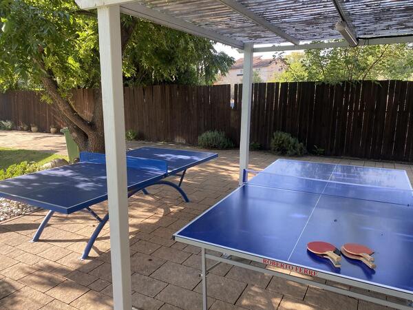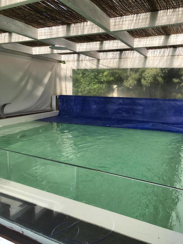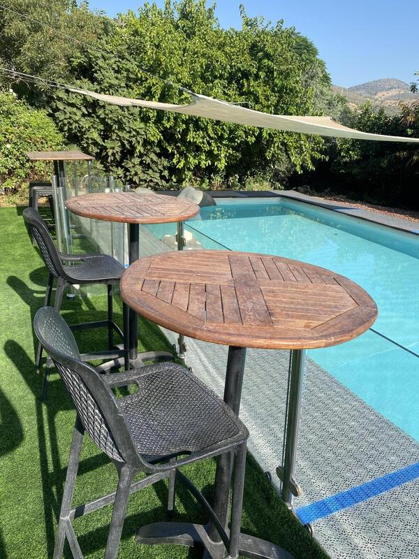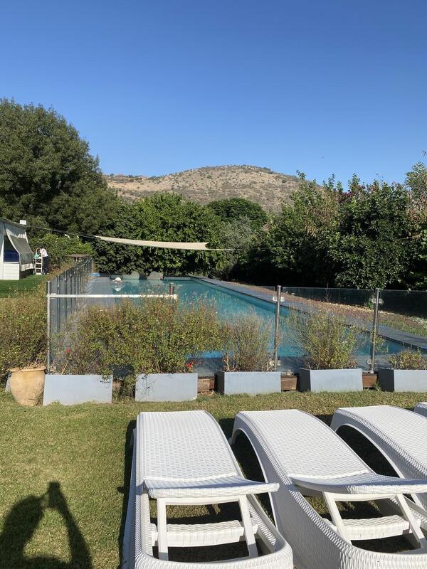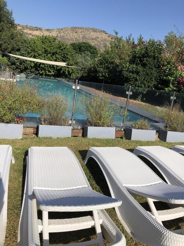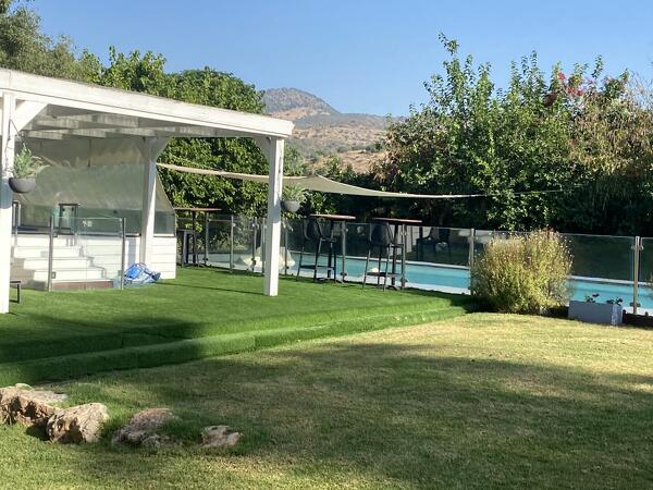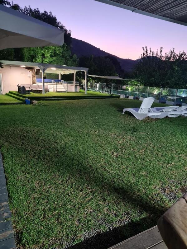מתחם החוץ: מהסלון יש יציאה למרפסת הצופה למרחבי מתחם החוץ היפייפה. במרפסת יש שולחן אוכל מעוצב, בר עם ברז בירה (בתוספת תשלום) וכיור חיצוני. המרפסת צופה אל מרחבי מדשאות ובריכת שחיה ענקית (ממש אבל!) בגודל 20X5 (לא מחוממת בחורף). ליד הבריכת שחיה ישנה בריכת זרמים מחוממת ומקורה, ומשולבת ג'קוזי ספא בגודל 4X4 מטר, ומתאימה ל-20 אורחים.