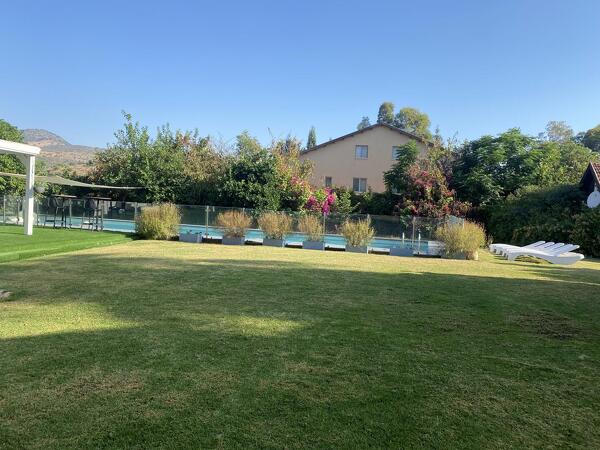 הוילה עצמה ממוקמת על שטח גדול ובו מדשאות, עצי פרי, בריכה פרטית גדולה ומגודרת, ערסלים, פינות ישיבה מוצלות, פינת BBQ ובריכת זרמים משולבת ג'קוזי ספא המתאימה לישיבה של כ-20 אורחים. בשטח פזורים גם 2 מבנים בהם שלושה חדרי שינה נוספים עבור המתארחים בוילה. האווירה כאן כפרית מאוד והעיצוב משלב הרבה אלמנטים מעץ.