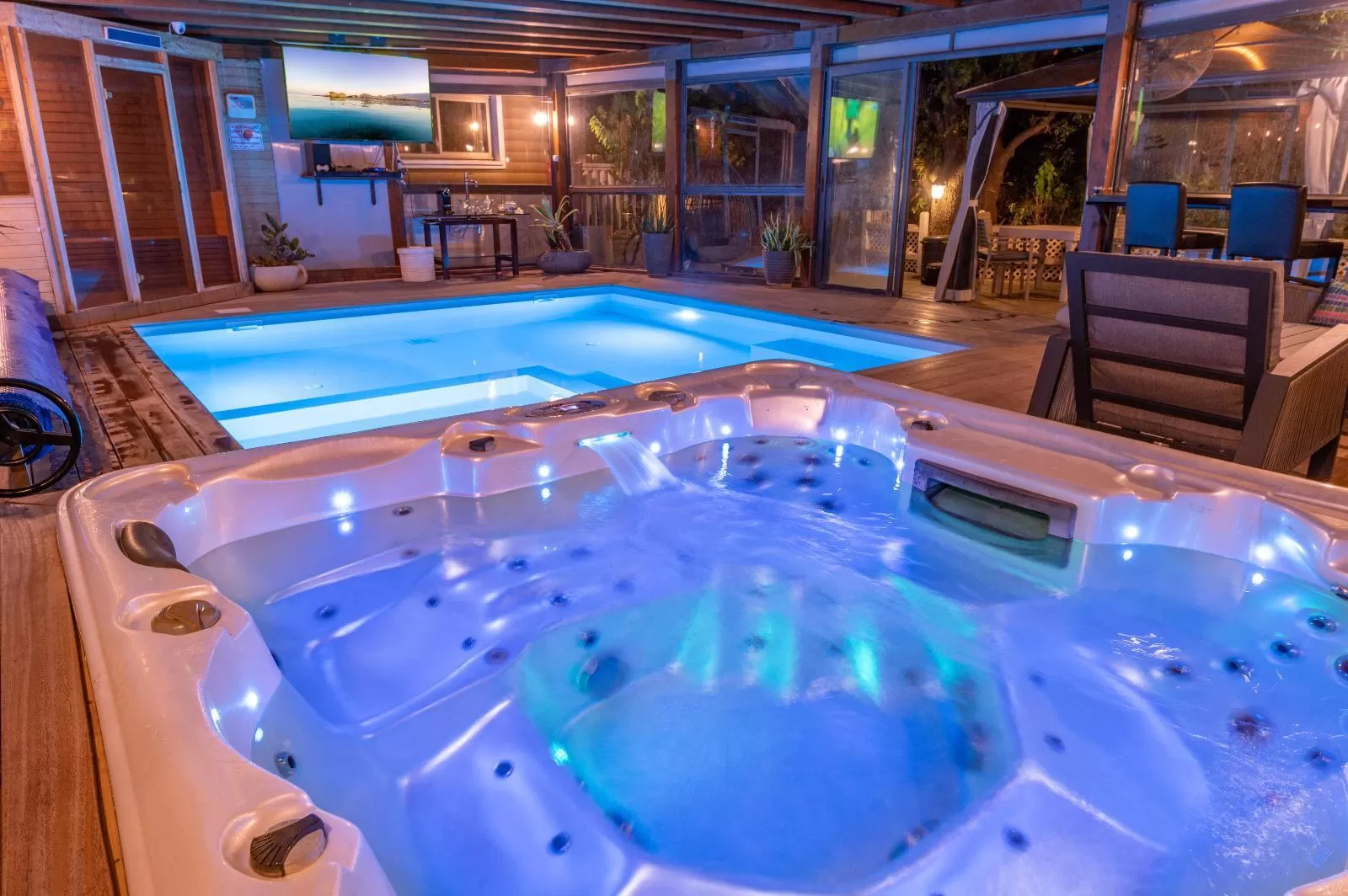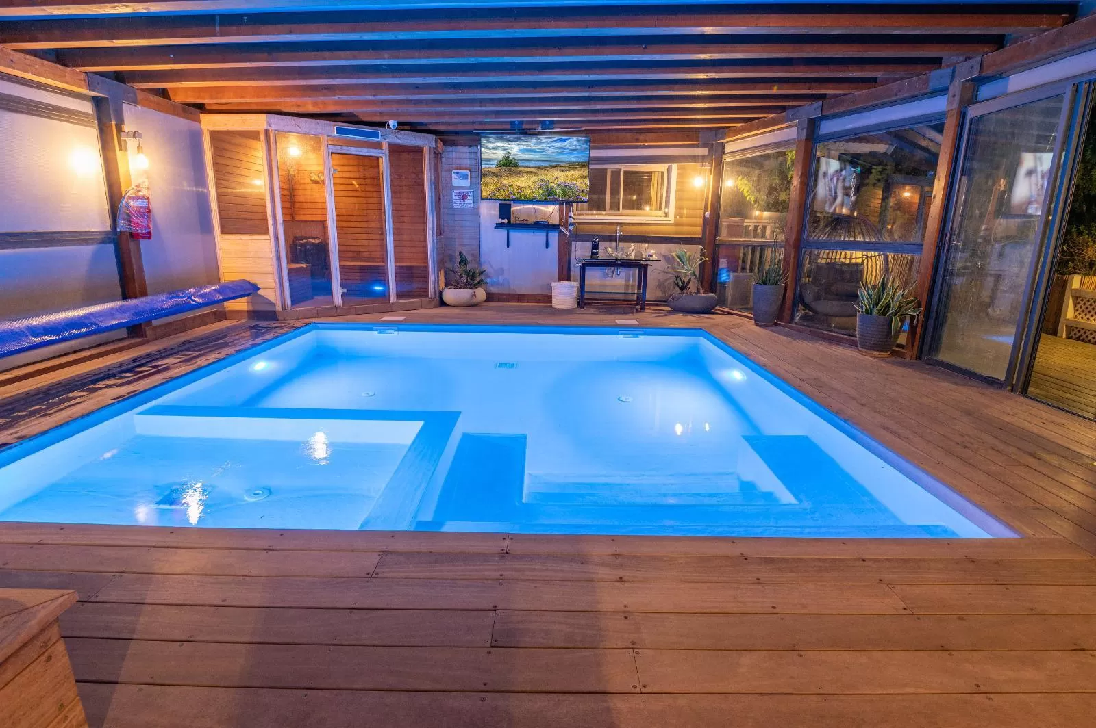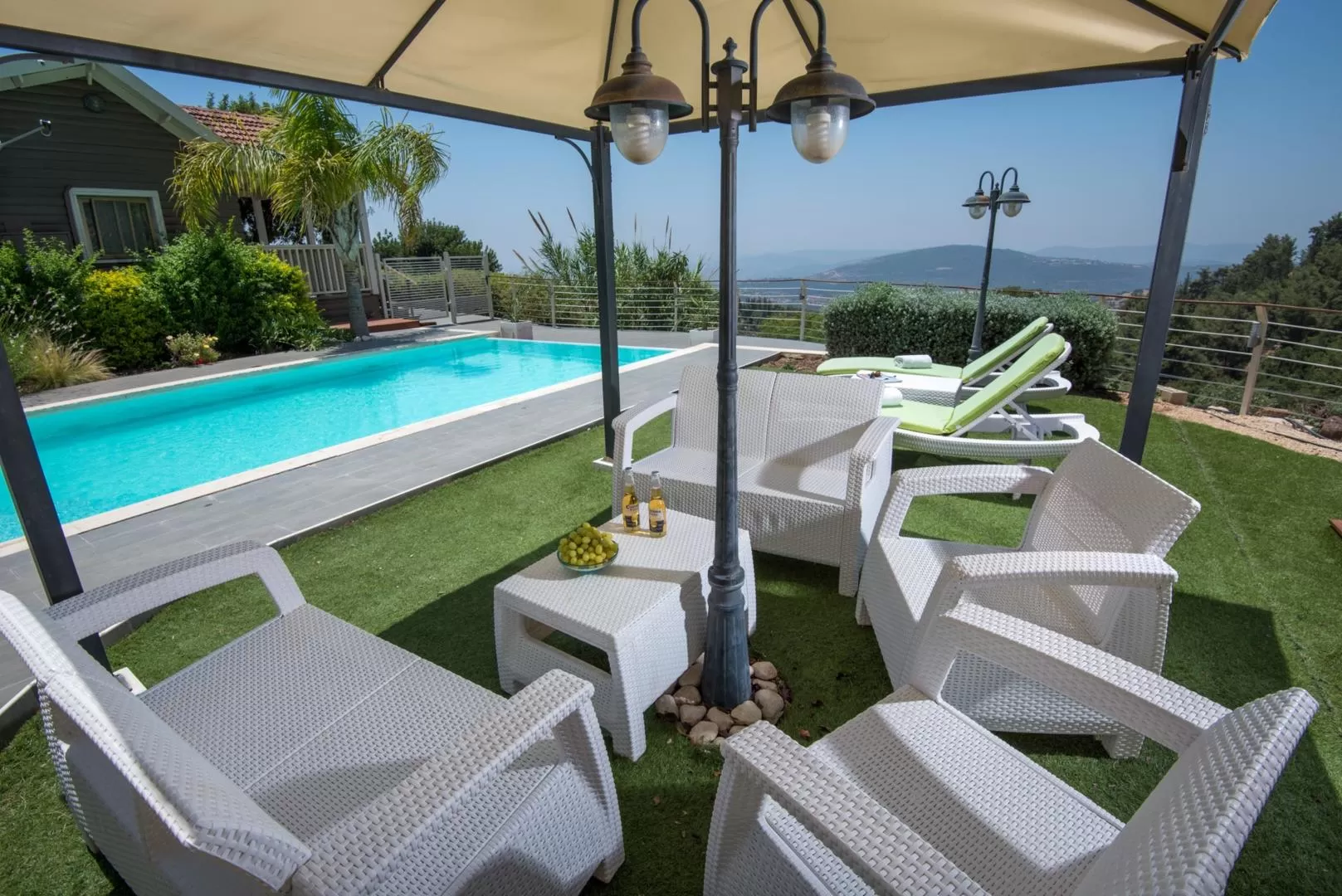 ניקוי הבריכה כאן עובד במערכת ניקוי ירוקה (UV) כך שלא מורגש ריח של כלור בחלל