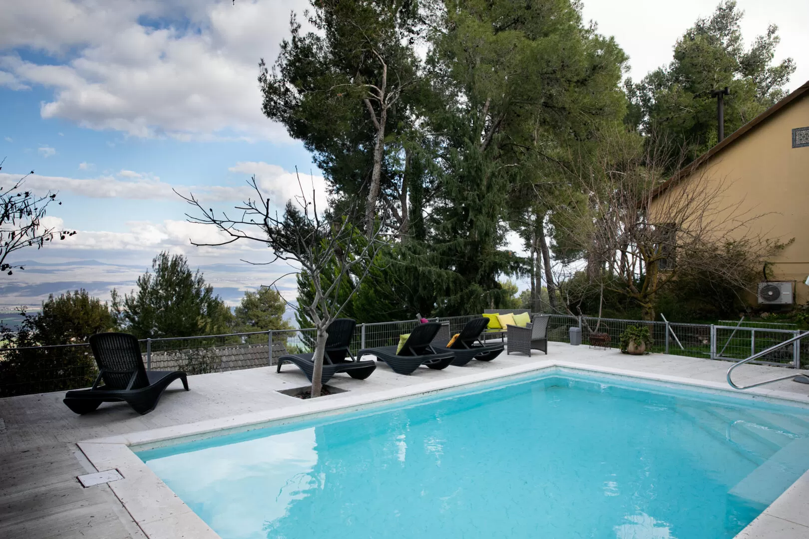 יציאה מהקומה התחתונה מוליכה אותנו אל מרפסת אחורית נעימה עם פינות ישיבה. משם מתגלה לו שביל קסום שחלקו מדרגות, והוא ייקח אתכם עד לאזור הבריכה של המתחם, או אל תוך החורש לטיול ספונטני. אזור הבריכה פתוח אל הנוף (שהוא באמת נדיר כאן). זוהי בריכה בנויה בגודל 4X6 מטר ומחוממת (עונתית -לא בחודשי החורף) עם פינות ישיבה נעימות שצופות לרכס הגולן ולחרמון. אין ספק שבקיץ מדובר בתענוג צרוף.