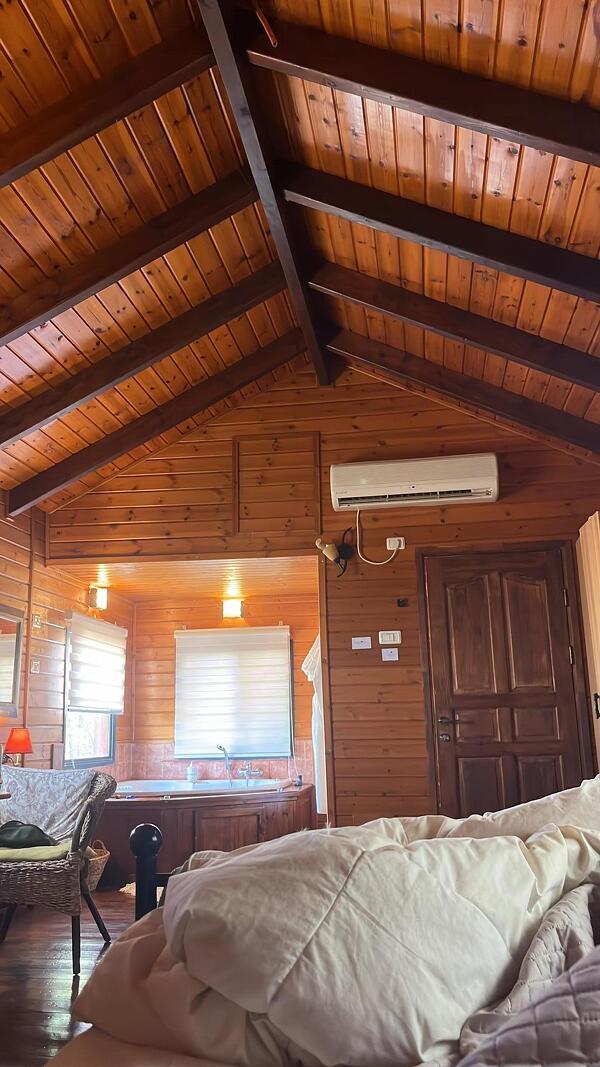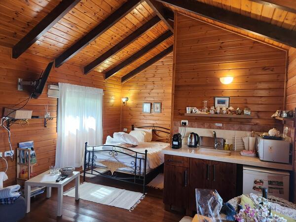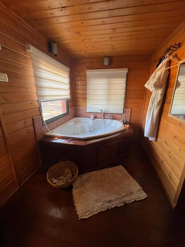 בצד המטבח יש פינת אוכל קטנה המתאימה ל-4 סועדים. בסלון תמצאו שתי כורסאות בד, טלוויזיה של 42 אינץ' עם חיבור להוט, ואת הקמין הגדול שיושב על במת אבן ייחודית, ובצידו עצי הסקה לחימום נעים של המרחב.