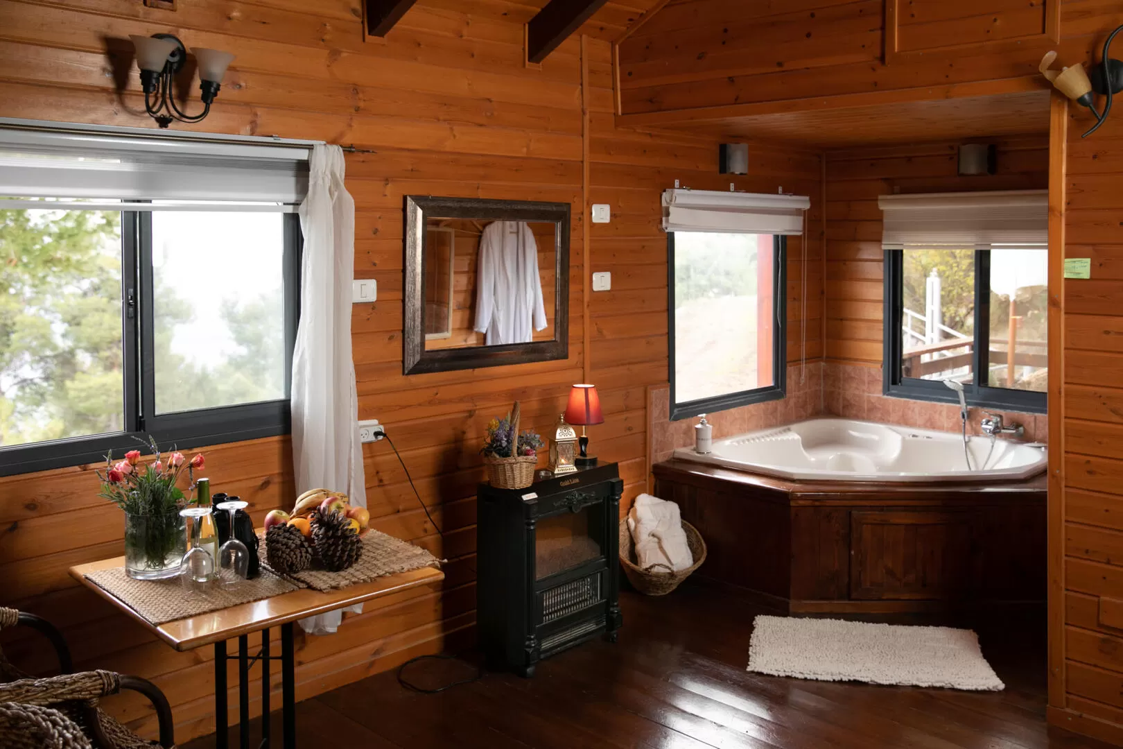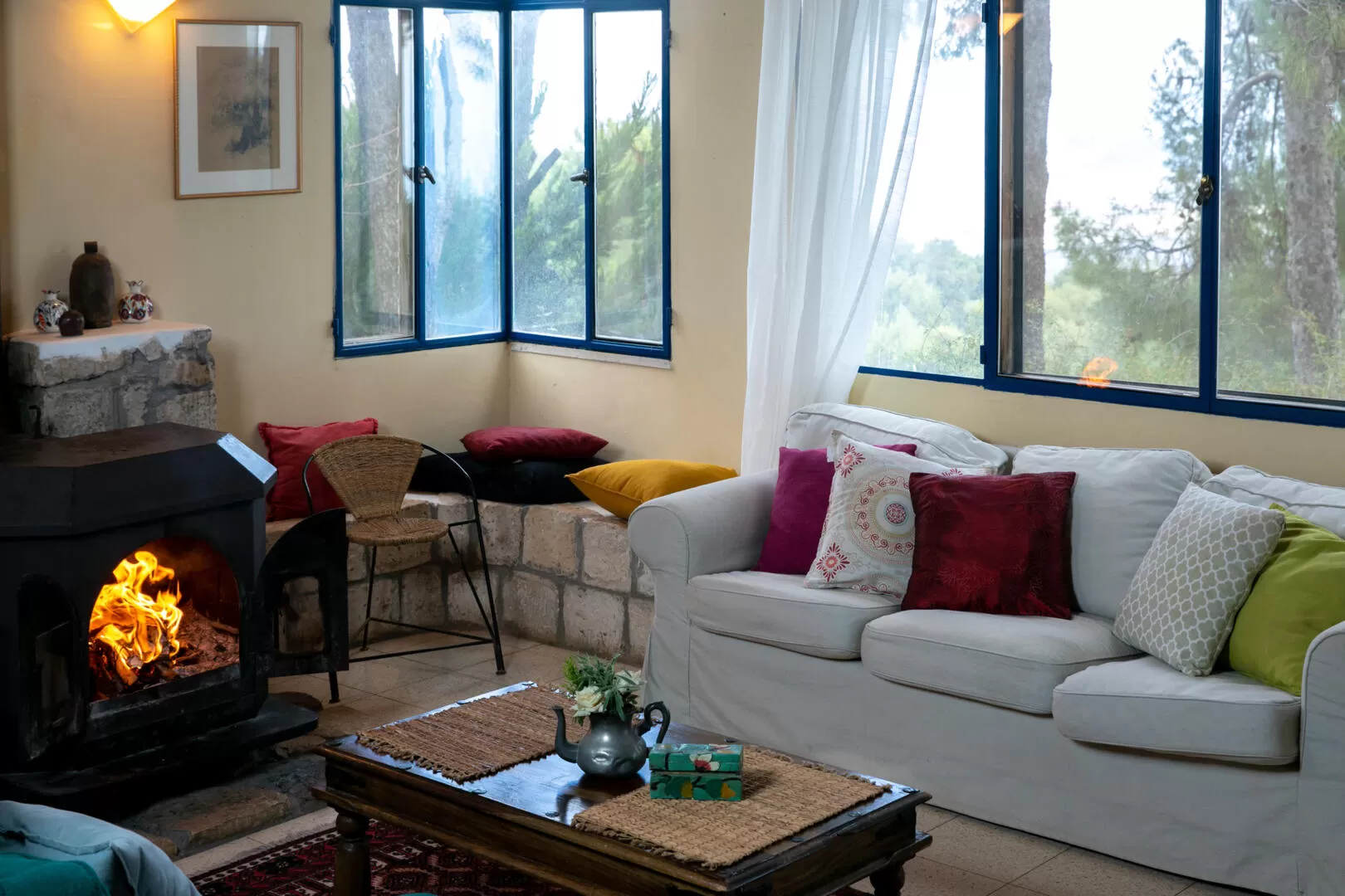 בצד המטבח יש פינת אוכל קטנה המתאימה ל-4 סועדים. בסלון תמצאו שתי כורסאות בד, טלוויזיה של 42 אינץ' עם חיבור להוט, ואת הקמין הגדול שיושב על במת אבן ייחודית, ובצידו עצי הסקה לחימום נעים של המרחב.