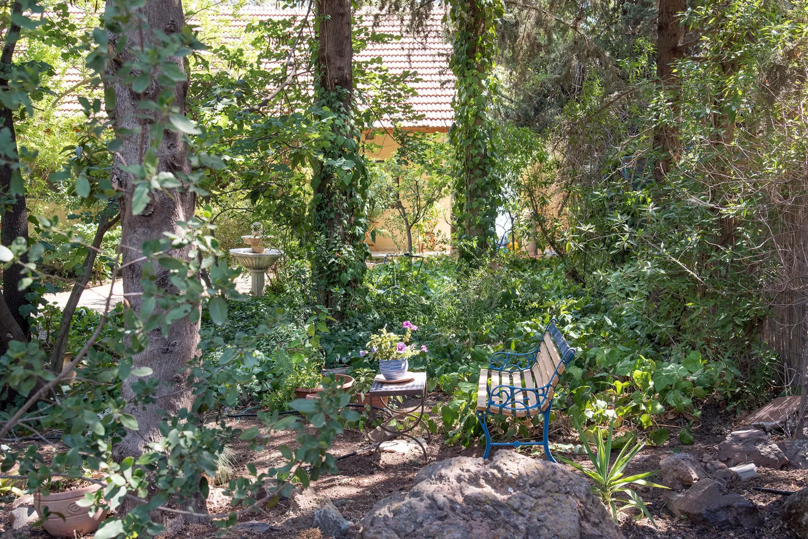 יציאה מהקומה התחתונה מוליכה אותנו אל מרפסת אחורית נעימה עם פינות ישיבה. משם מתגלה לו שביל קסום שחלקו מדרגות, והוא ייקח אתכם עד לאזור הבריכה של המתחם, או אל תוך החורש לטיול ספונטני. אזור הבריכה פתוח אל הנוף (שהוא באמת נדיר כאן). זוהי בריכה בנויה בגודל 4X6 מטר ומחוממת (עונתית -לא בחודשי החורף) עם פינות ישיבה נעימות שצופות לרכס הגולן ולחרמון. אין ספק שבקיץ מדובר בתענוג צרוף.