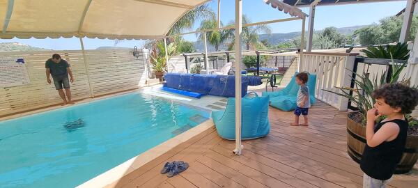 מדובר בבית פרטי עם כניסה מטופחת וחניה פרטית. נכנסתי לחצר ומשם השביל מתפצל ל-3 מרחבים: כניסת הוילה עם פינות ישיבה, ומעבר לאזור הזה, נכנסים למתחם "דק" סביב בריכה גדולה ומחוממת, ובתוכה - הפתעה נעימה: משטח רביצה גדול עם זרמים. מסביב: מיטות שיזוף (בקיץ), שמשיות, ג'קוזי ספא, ופינת ישיבה.