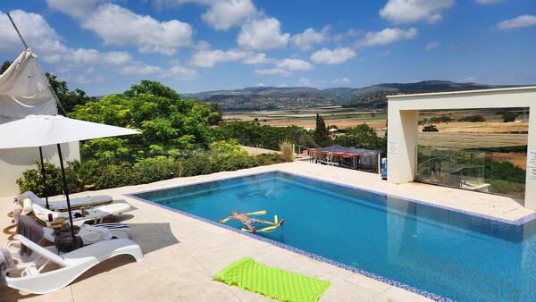 מהסלון, שמכיל גם בר עם אלכוהול וטלויזיה ענקית "70, יוצאים למרפסת מרווחת וגבוהה עם נוף פנורמי שמתחיל בבריכת השחיה הענקית ונגמר איפשהו בשדות הירוקים ובהרים שמאחוריהם. על מנת להגיע לבריכת השחיה (הלא מחוממת) יש לרדת למפלס התחתון של המתחם שהוא כולו שלכם.
