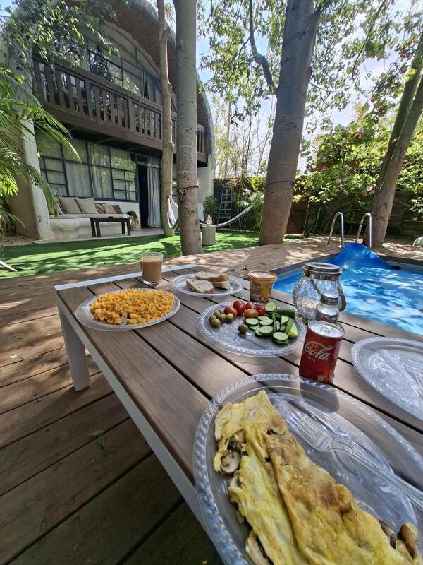 מתחם החוץ מוקף בגדר עץ המאפשרת פרטיות מלאה ובו פינות ישיבה נוחות, ערסלים ובריכת שחייה מחוממת ופרטית (אינטקס).