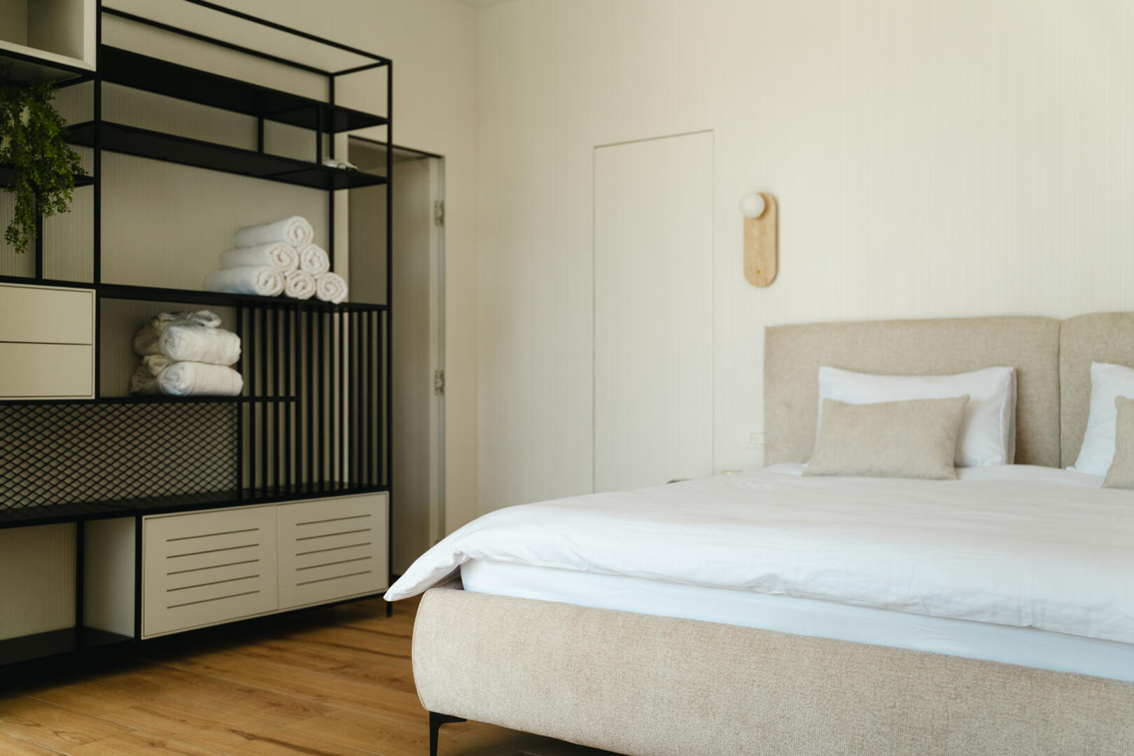 החלל הפנימי בוטיקי, מינימליסטי ומעוצב ברמה גבוהה: מיטה זוגית מרשימה, ג'קוזי מרובע וגדול, מטבחון פונקציונלי ובר עם שני כיסאות שמשמש כפינת אוכל זוגית חמודה וחדר שינה נוסף המתאים לאירוח עם ילדים. פלטת הצבעים ששולטת פה היא רכה ונעימה, ורצפת הפרקט מוסיפה עוד חמימות לחלל המינימליסטי והיוקרתי.