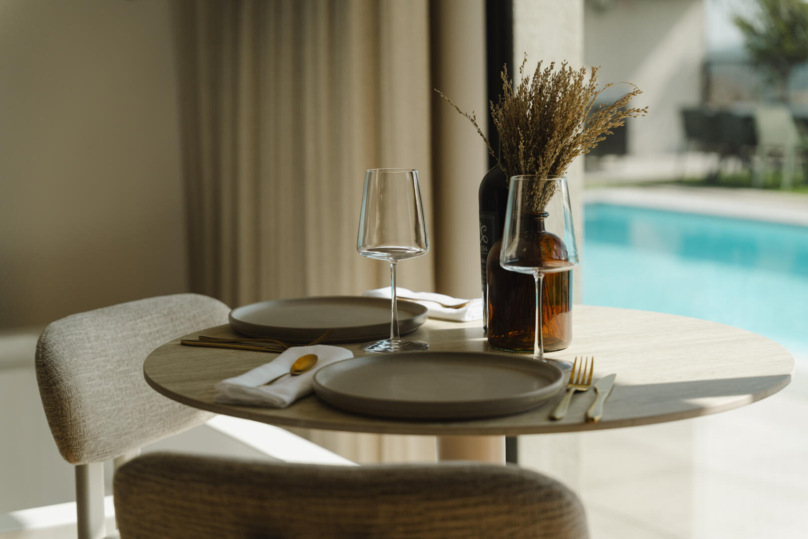 חלון ענק שצופה אל הנוף והבריכה, ומוסתר על ידי וילון הצללה שגם מעניק פרטיות מלאה כשצריך.