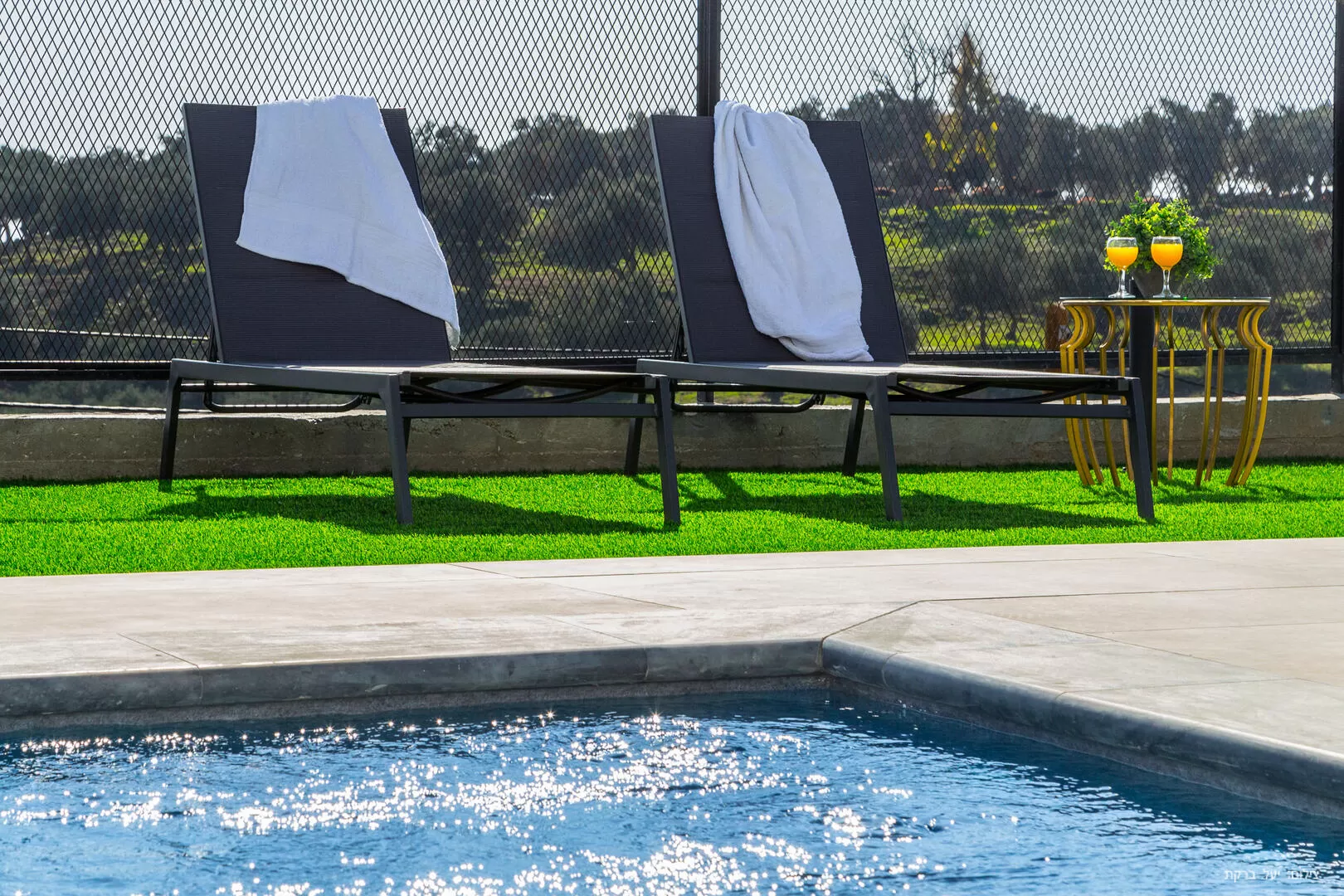 לסוויטה חצר גדולה ומגודרת עם בריכה בנויה, מחוממת ומקורה, גדולה ומושקעת ביותר, שצופה אל הנוף שעליו כבר הרעפנו מחמאות למעלה.
