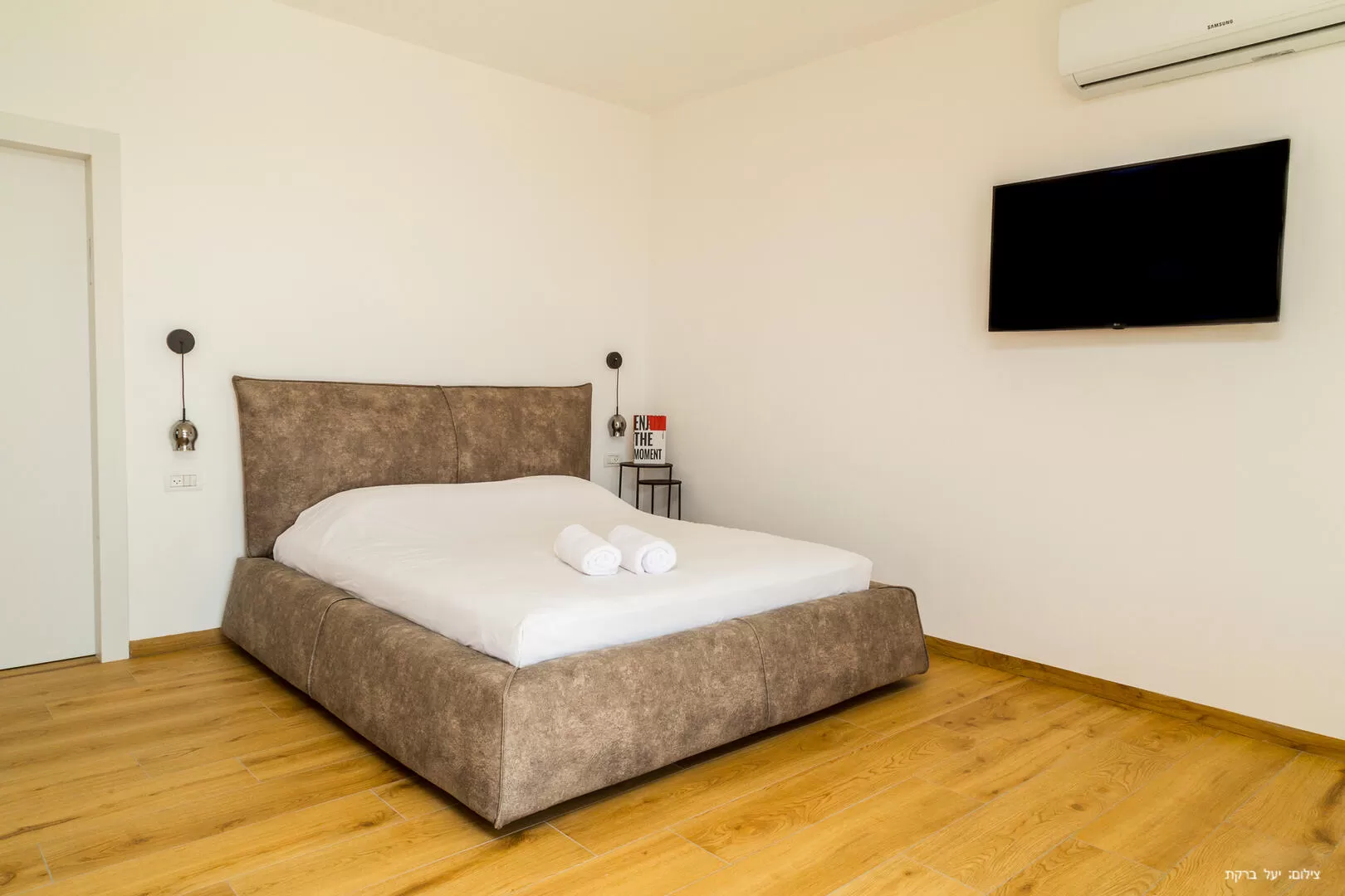החלל הפנימי בוטיקי, מינימליסטי ומעוצב ברמה גבוהה: מיטה זוגית מרשימה, ג'קוזי מרובע וגדול, מטבחון פונקציונלי ובר עם שני כיסאות שמשמש כפינת אוכל זוגית חמודה וחדר שינה נוסף המתאים לאירוח עם ילדים. פלטת הצבעים ששולטת פה היא רכה ונעימה, ורצפת הפרקט מוסיפה עוד חמימות לחלל המינימליסטי והיוקרתי.