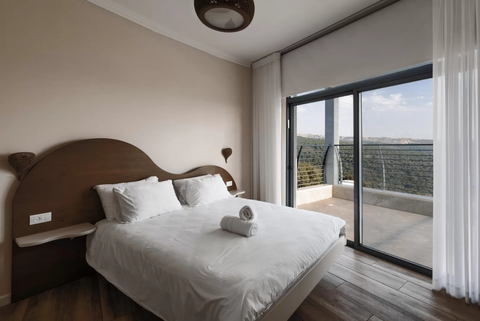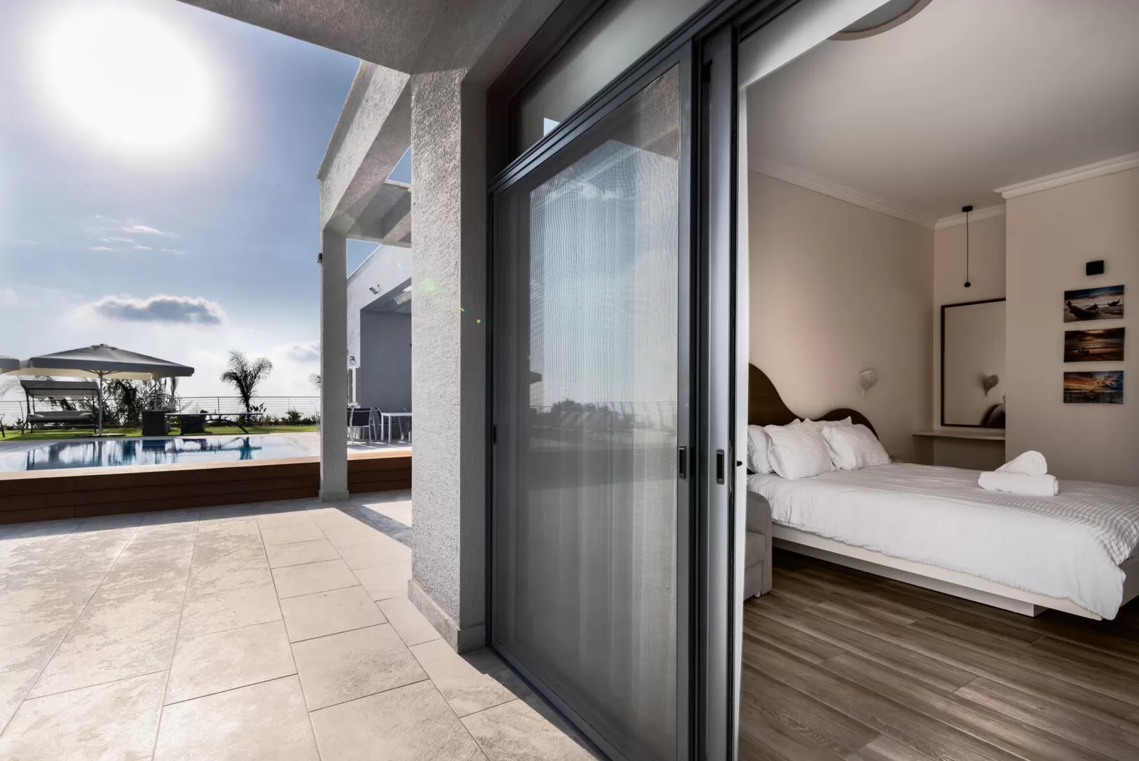 באחוזה סה"כ 7 חדרי שינה: בקומת הכניסה ישנם 4 חדרי שינה - אחד שמשמש גם כממ"ד גדול ומרווח, ונמצא בצד הקרוב יותר לאזור הסלון. בצמוד אליו ישנו חדר מקלחת עם שירותים פרטיים. בצדו השני של החלל, נמצאים 3 חדרי השינה הנוספים - כולם זהים כמעט לגמרי, ומציעים מיטה זוגית, טלוויזיה, חלון גדול שפונה אל הנוף עם יציאה ישירה לאזור הבריכה, ומקלחת ושירותים פרטיים לכל חדר. הטאץ' העיצובי השולט בחדרי השינה הוא צבעים בהירים שמשתלבים עם פריטי עץ כפריים ואהילי חימר דקורטיביים שנעשו בעבודת יד. פשטות יוקרתית ויפהפיה.