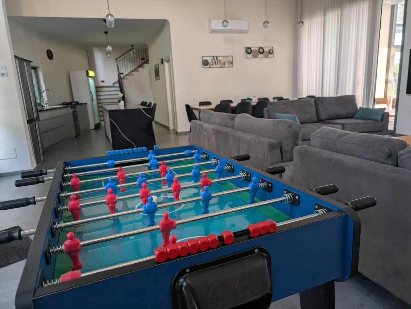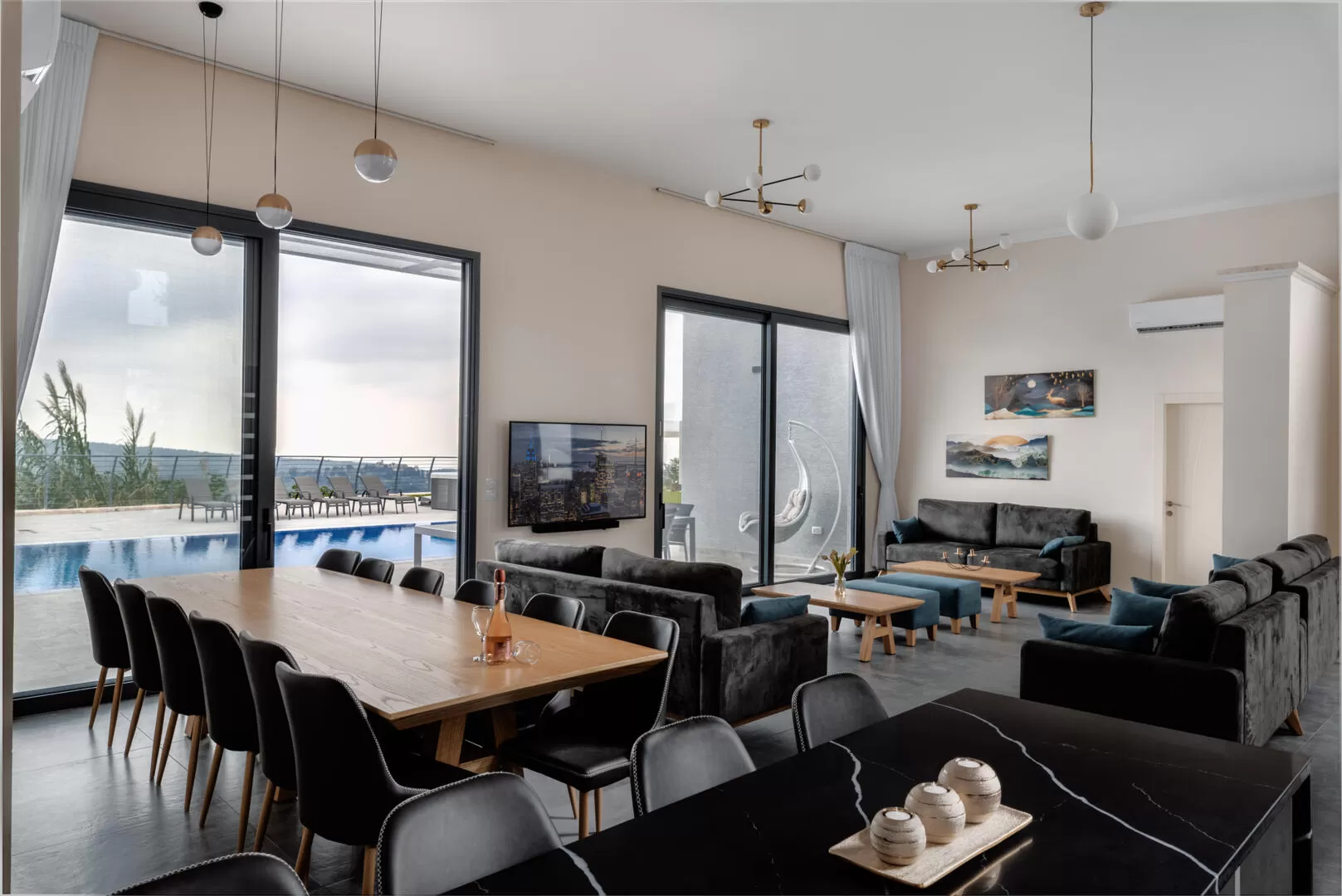 כשנכנסים פנימה מגלים חלל ענק שמעוצב בסטייל אלגנטי מושלם - סלון רחב ידיים ניצב במרכז מול שני חלונות גדולים שמשקיפים אל הנוף הפתוח, ולצדו פינת אוכל שמתאימה לכ-16 סועדים. מטבח סופר יוקרתי ופתוח אל הסלון, מאובזר בכל מה שצריך ומציע גם אי גדול עם פינת ישיבה נפרדת.