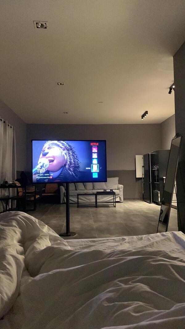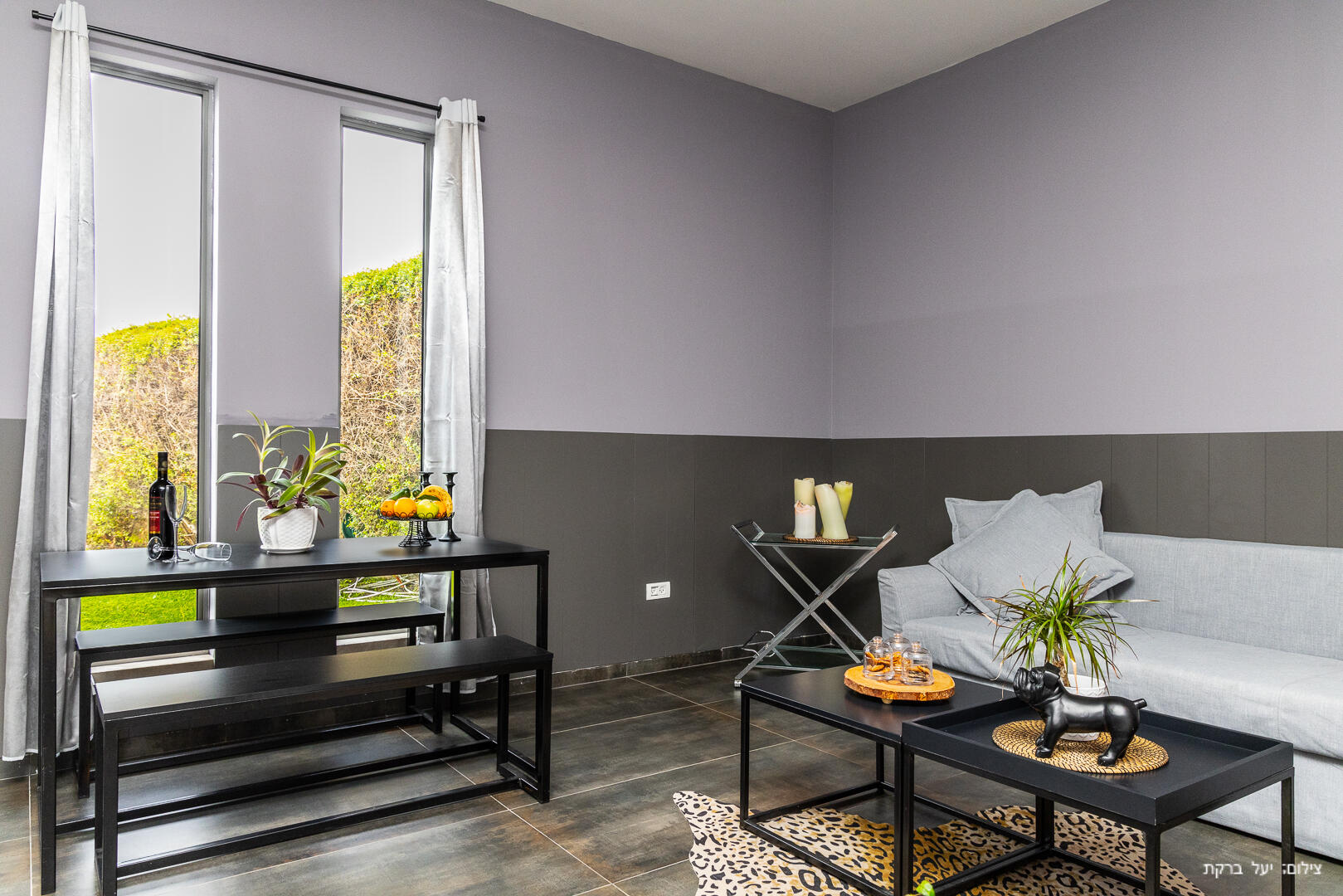סוויטה אחת ויחידה, מרווחת מאוד ויש בה בכל מה שצריך: מיטת קינג גדולה עם מזרן אורטופדי ממותג איכותי, ממולה טלוויזיה סמארט מתכווננת עם גישה לנטפליקס, מטבח גדול ומאובזר לבישול עם מקרר גדול ותנור, בר מים וכלי אוכל, סלון קטן עם ספה ושתי כורסאות ישיבה מעוצבות, ומקלחון מרווח ונעים. הגוונים ששולטים בחלל הם לבן, שחור ועץ טבעי, שמעניקים תחושה יוקרתית ומינימליסטית שמתכתבת עם הפרקט הכהה.