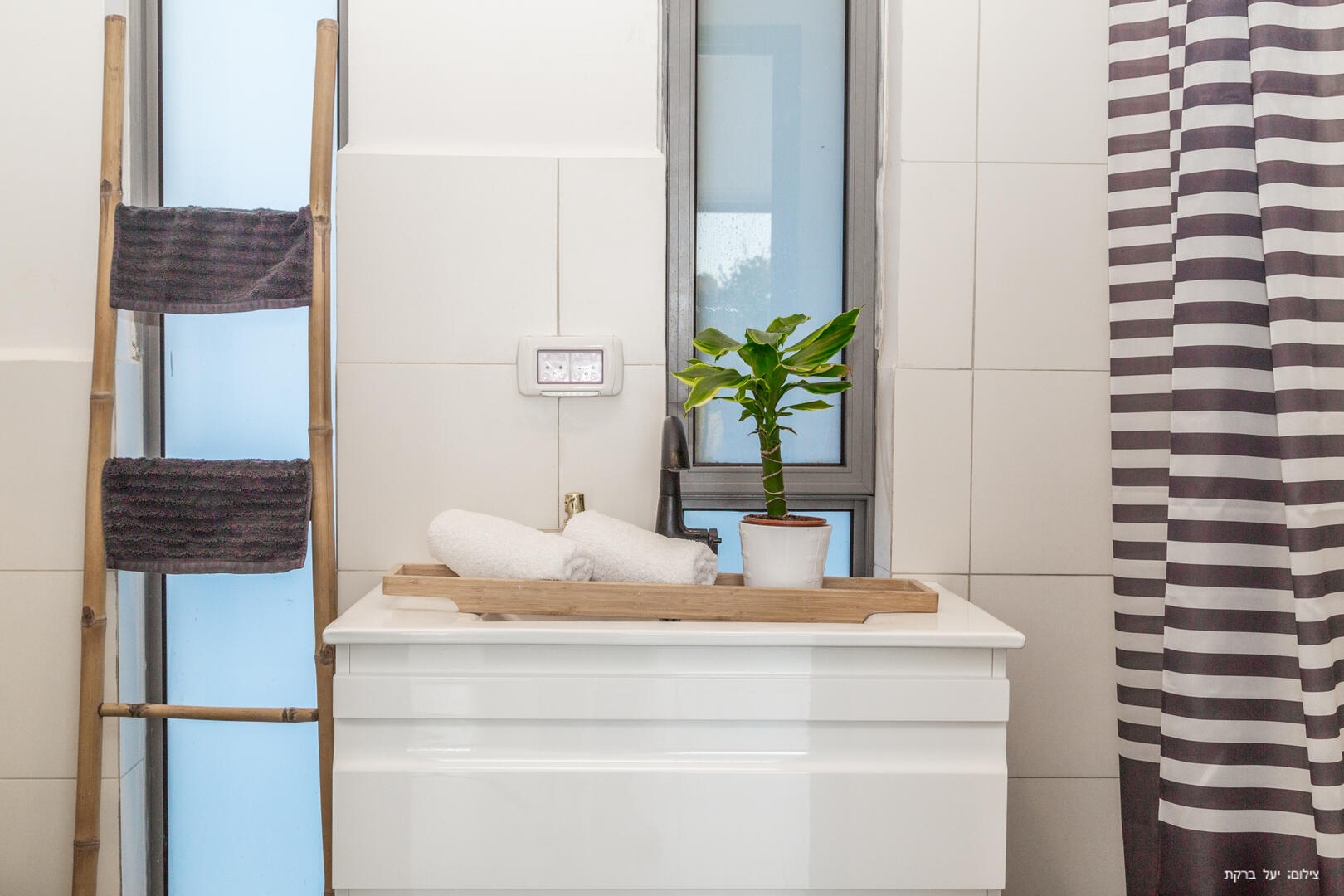 סוויטה אחת ויחידה, מרווחת מאוד ויש בה בכל מה שצריך: מיטת קינג גדולה עם מזרן אורטופדי ממותג איכותי, ממולה טלוויזיה סמארט מתכווננת עם גישה לנטפליקס, מטבח גדול ומאובזר לבישול עם מקרר גדול ותנור, בר מים וכלי אוכל, סלון קטן עם ספה ושתי כורסאות ישיבה מעוצבות, ומקלחון מרווח ונעים. הגוונים ששולטים בחלל הם לבן, שחור ועץ טבעי, שמעניקים תחושה יוקרתית ומינימליסטית שמתכתבת עם הפרקט הכהה.