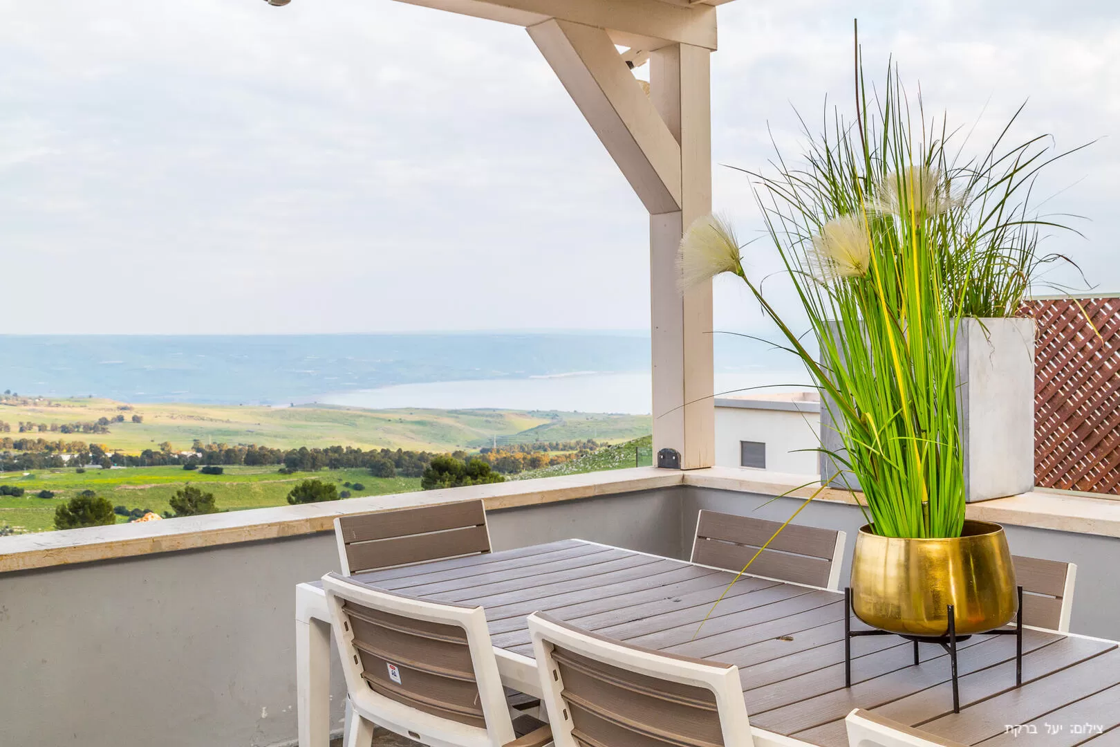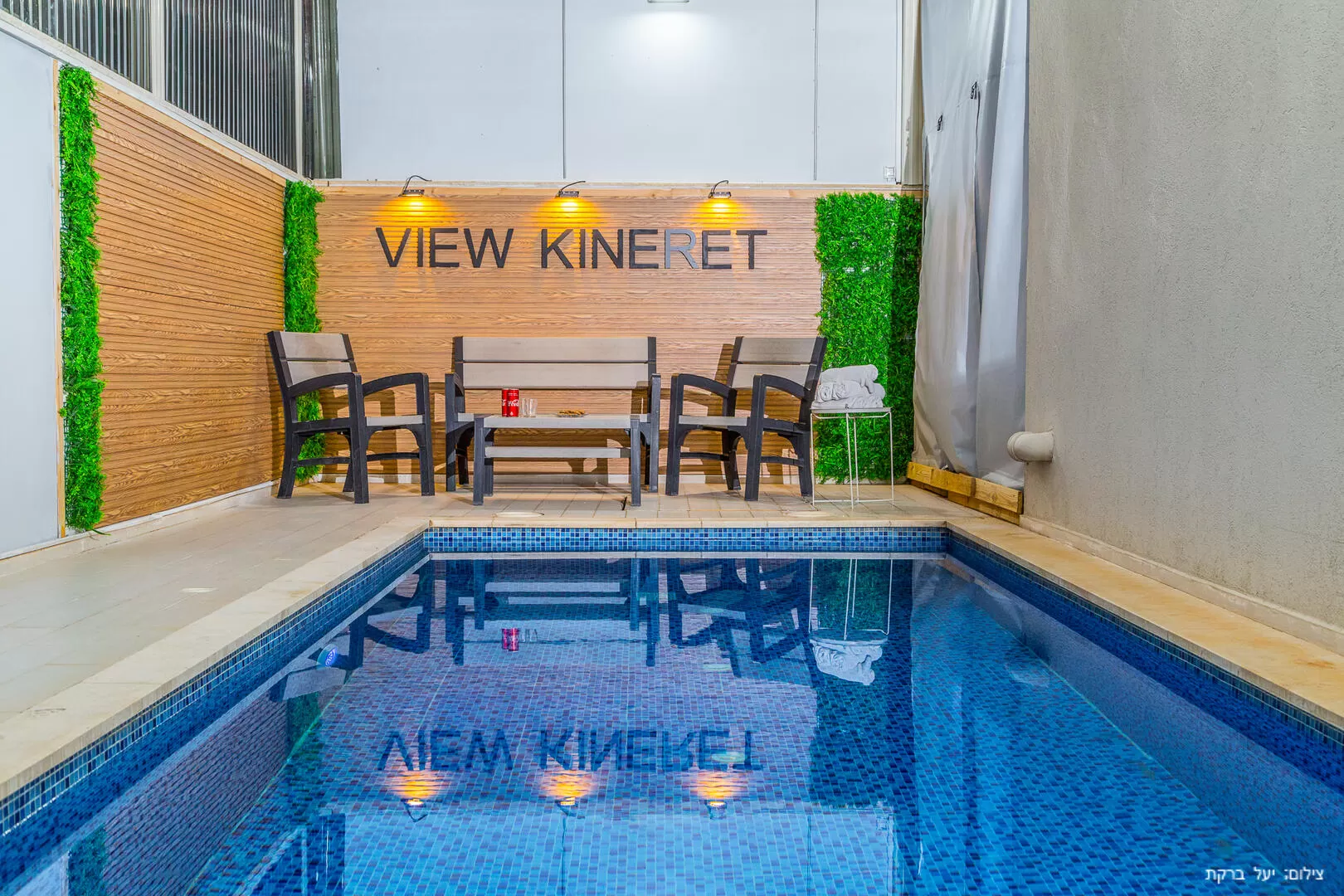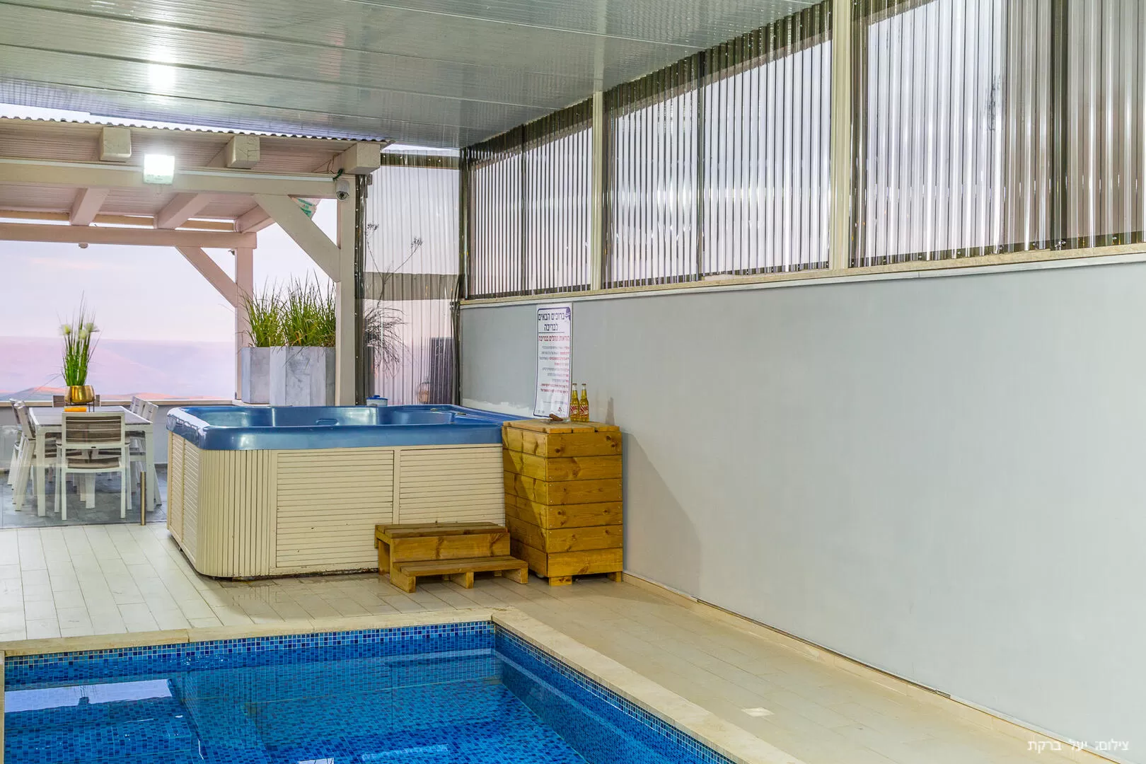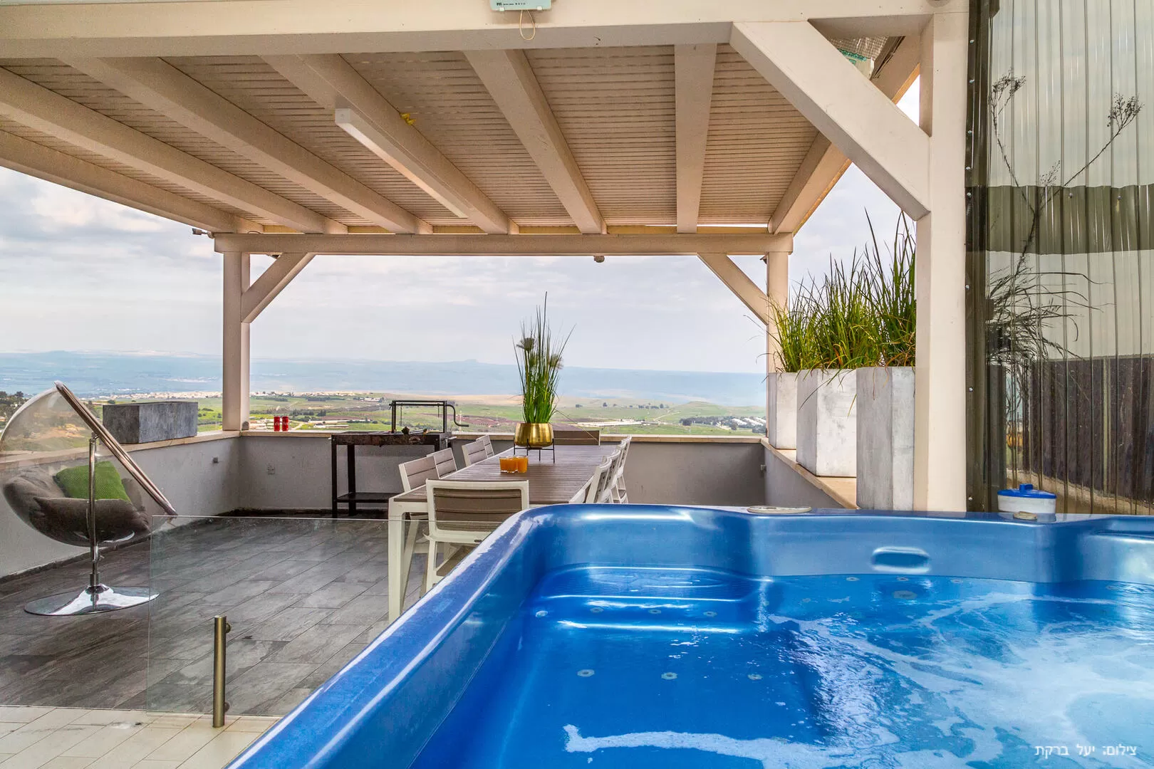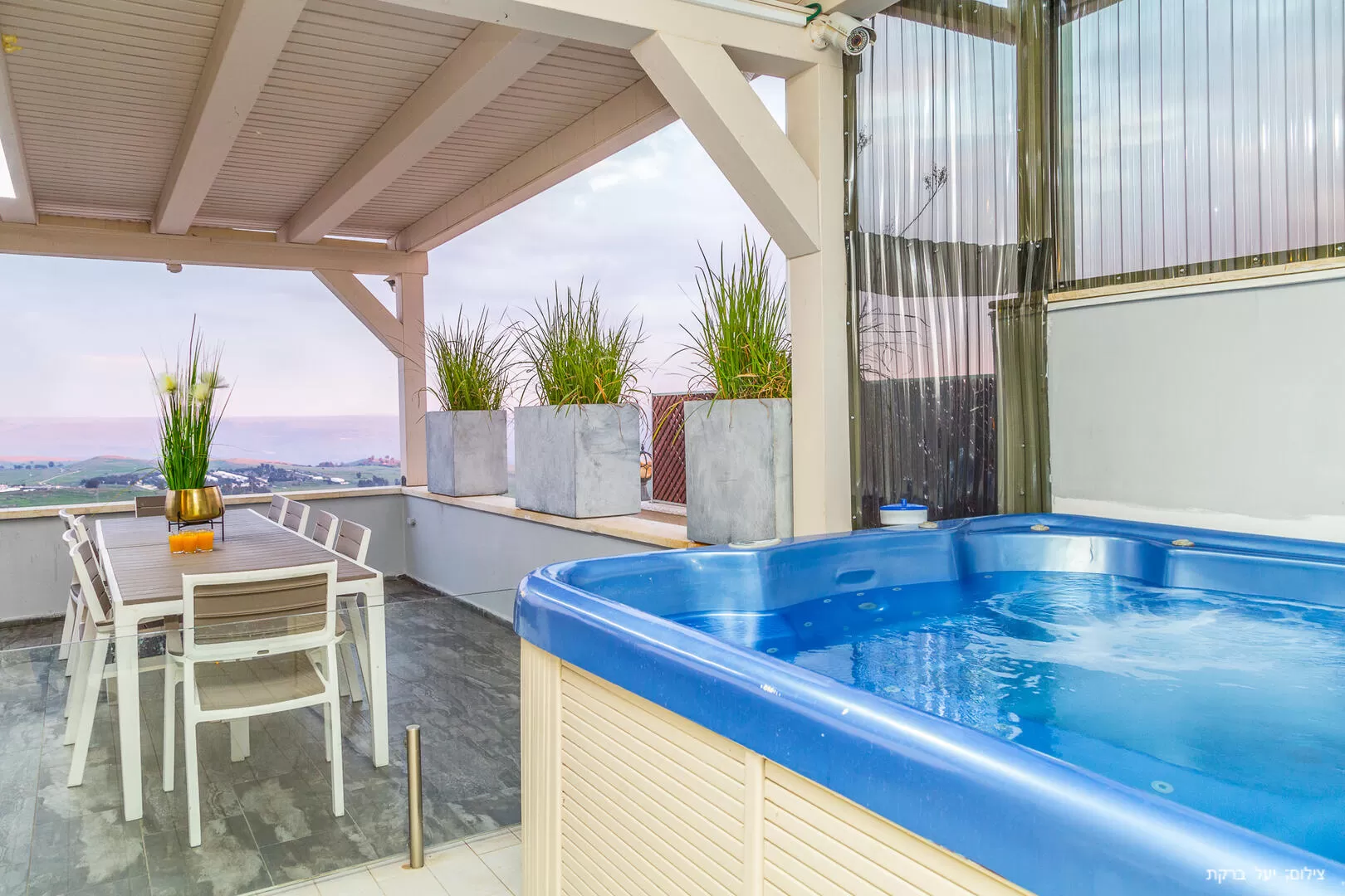 רגע לפני שנכנסים לווילה, חולפים על פני מתחם החוץ - יש כאן מרפסת דק שמוקפת בנוף מדהים לכנרת, פינת ברביקיו (פחמים) ופינת אוכל חמודה. בחלק השני של המתחם שמופרד באמצעות שער זכוכית (עם נעילת ילדים) נמצאים הפינוקים - ג'קוזי ספא גדול ובריכה יפה השקועה ברצפה, מחוממת ומקורה - גם מכאן אפשר לראות את הנוף הקסום. האווירה בחלק הזה סופר אינטימית וחמימה, ומאפשרת הרגשת פרטיות ונוחות מקסימלית.