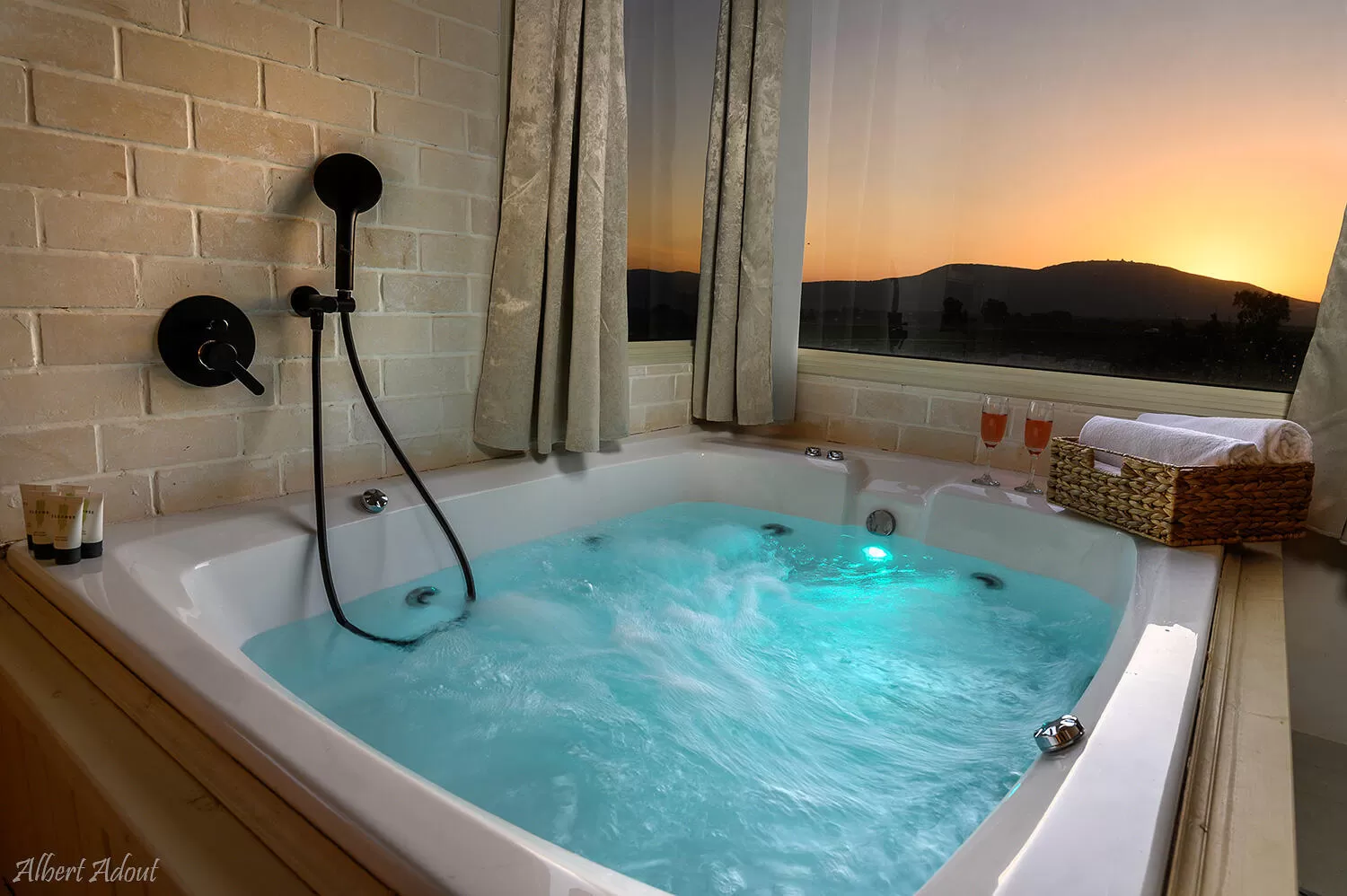 בפנים אנחנו מגלים חלל סופר נעים, נקי ומרווח עם תקרה גבוהה וגופי תאורה מושקעים. בחלל הכניסה יש מיטה זוגית, פינת אוכל קטנה, מטבחון (לא מתאים לבישול), מקרר גדול יחסית ומיקרוגל. הג'קוזי ממוקם בסמוך לחלון גדול שמשקיף אל הנוף. חדר הרחצה של כל סוויטה נעים ומושקע, מעוצב בגווני קונטרסט של שחור-לבן עם נגיעות זהב יוקרתיות.