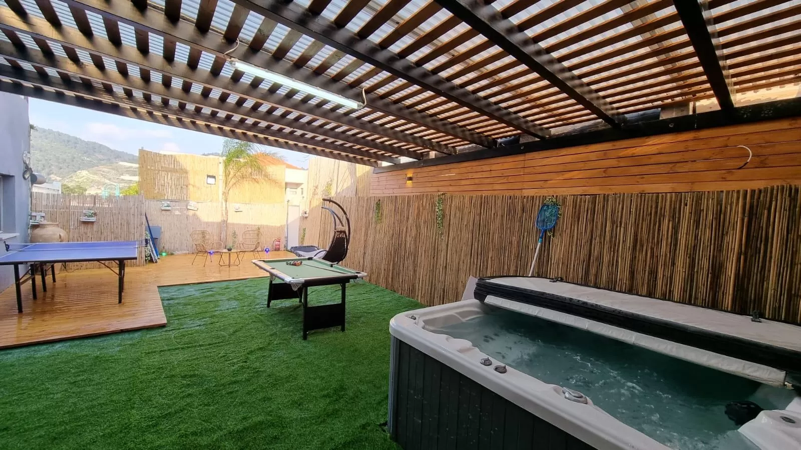 מתחם החוץ מחולק לשניים: בחצר הקדמית ג’קוזי ספא המתאים לעד שישה אנשים, ובחצר האחורית בריכה בנויה בגודל 8.5×3 מ’, מחוממת ומקורה בחורף. בין מפלס החדרים למפלס הסלון והחצר האחורית קיימת ירידה של כחמש מדרגות.