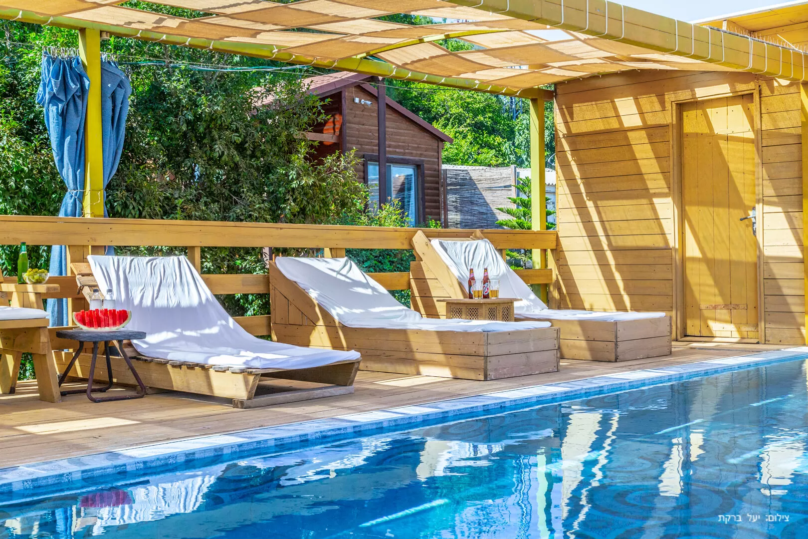 מספר צעדים מכל בקתה דרך עצי הנוי בחצר תגיעו אל בריכה גדולה ומגודרת, עשויה כולה מעץ ופונה אל נוף הרים מוריק. תמצאו בה משטח רביצה ומיטות שיזוף.