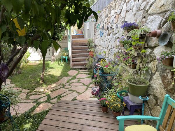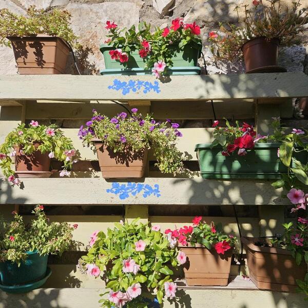החצר מוקפת צמחייה מטופחת בשיא פריחתה, גדר אבן שמקיפה אותה מפרידה אותה מן החוץ, והבריכה הבנויה נעימה ומשתלבת ברצפת דק. לצד הבריכה תמצאו כיסאות נדנדה של פעם והרבה קישוטים בעבודת יד שמצויים בכל פינה, בחוץ ובפנים צימר העץ, החמים והקוסם בפשטותו.